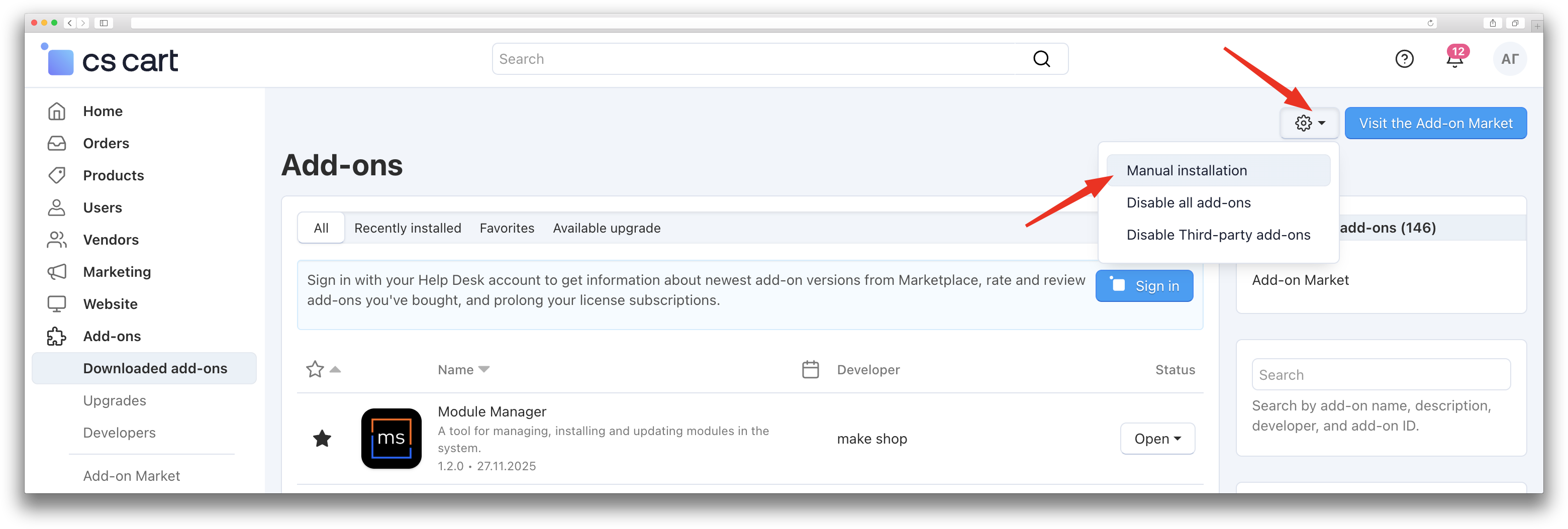 For CS-Cart versions higher than 4.18.1: Admin Panel → Addons → Downloaded Addons → Gear icon → Manual installation.