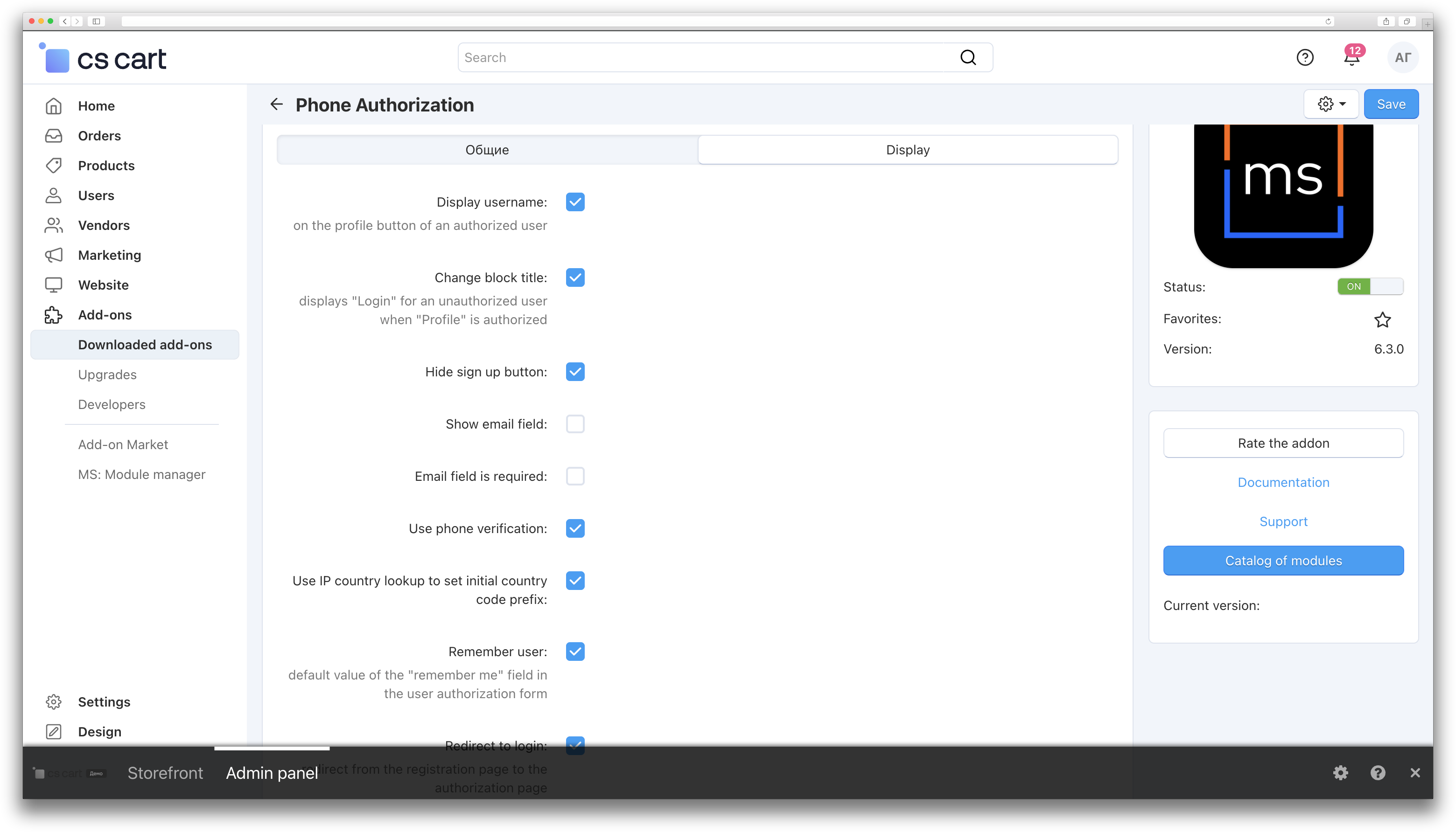 [!] Fixed several authorization-related bugs on mobile devices [+] Added hiding of the profile dropdown and direct redirect to the authorization page if the user is not registered [!] Fixed phone number validation on the checkout page [+] Added a setting to select the default value of the “Remember me” field in the authorization form [+] Added an algorithm for verifying a registered user’s phone number if a different phone number is entered during checkout [!] Fixed marking the phone field as required [] Fixed JS rendering to improve performance (JS is rendered without waiting for the full page load) [+] Added compatibility with reCAPTCHA v3 [+] Added the ability to disable sending a successful registration notification to the user via addon settings [+] Added a mechanism to block the phone number input field until JS scripts are fully loaded (configurable via addon settings) [/] Changed the display of the profile icon in the top block on all pages