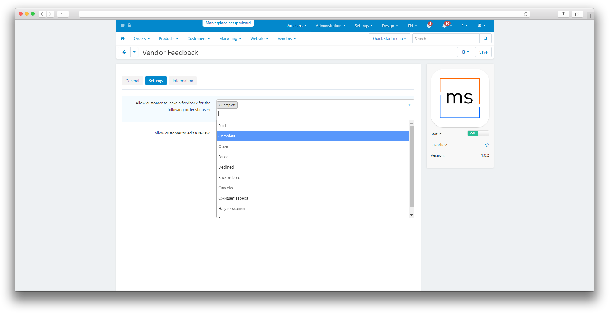 In the add-on settings, it is necessary to specify at which order status customers can evaluate the seller's work according to various parameters.