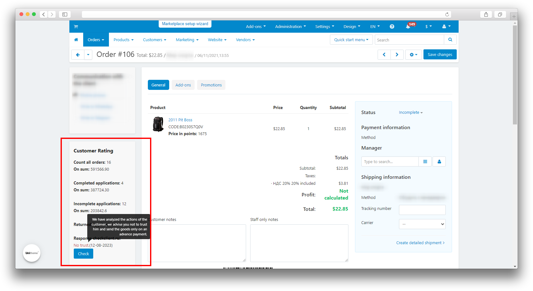 Thanks to the integration of the add-on with the checkclient.ru service, customer reliability is checked based on an analysis of their order history on various internet platforms. This tool allows you to reduce the risks of financial losses associated with transportation expenses for delivering goods and their return, by making more informed decisions when choosing a payment format for each customer.