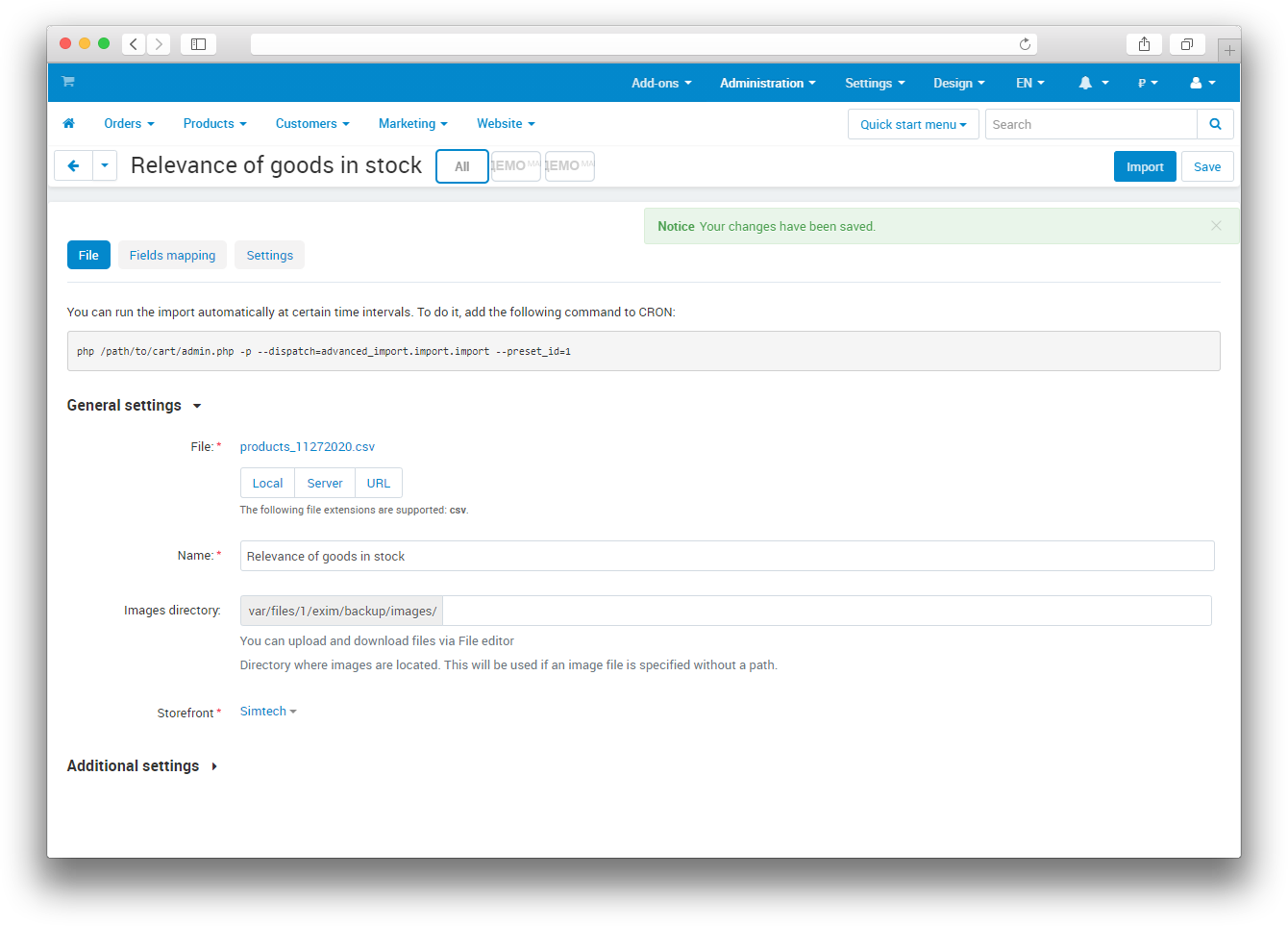 If you have a leftover file from a supplier, you can automate the process. To do this, you need to create an import template. On the Administration - Import data - Products page add a new import.