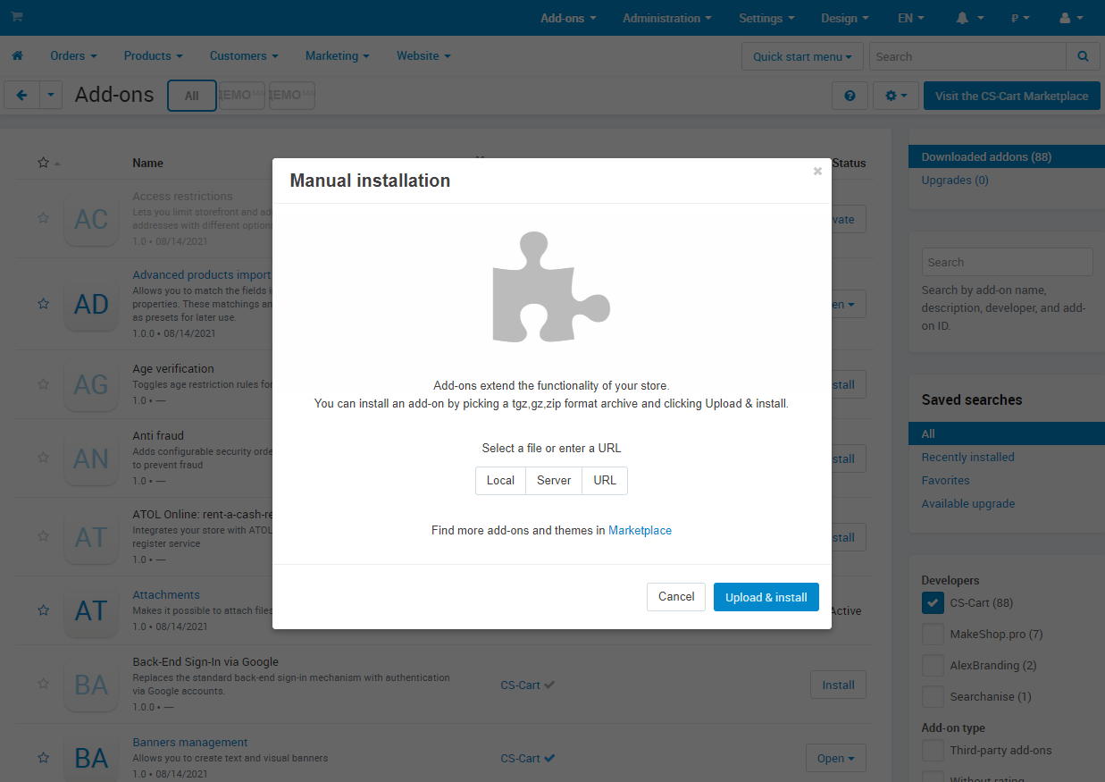 After downloading the add-on, its installation is carried out using standard CS-Cart tools on the page Administrator panel → Add-ons → Manage add-ons → Download and install add-on (+).