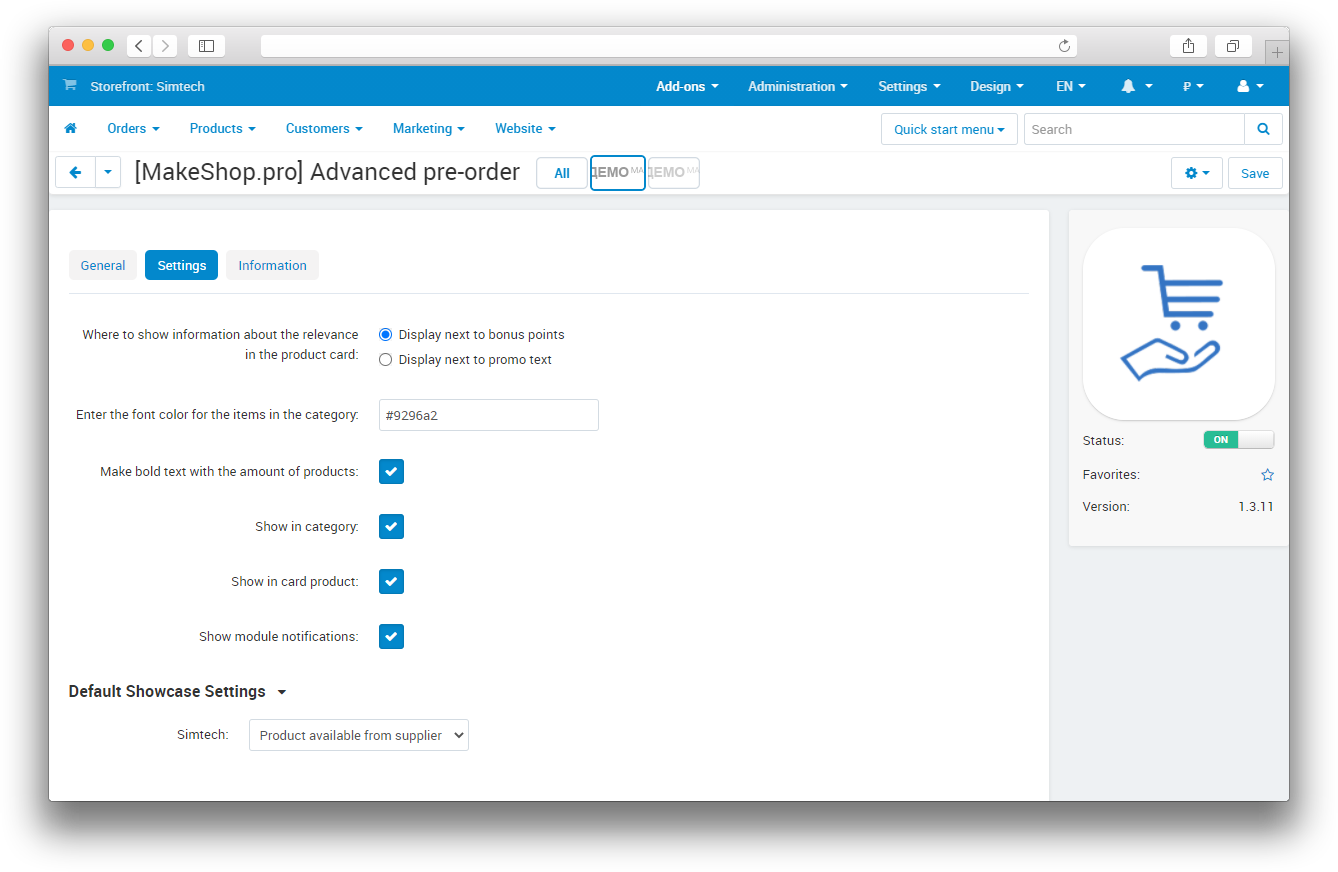 [*] Changed the position of the checkbox "Product in stock at the supplier" by default after installing the add-on