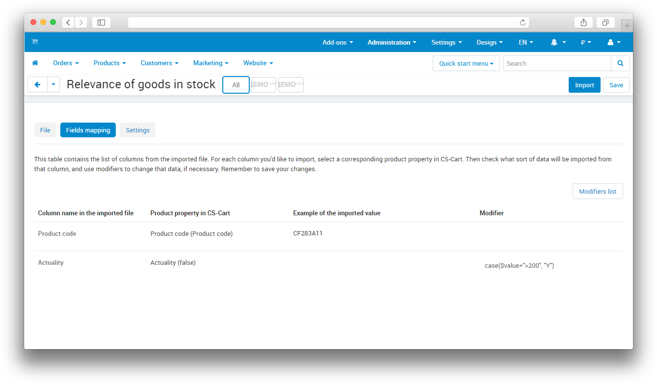 Now go to the Field Mapping Table tab and select the appropriate fields. For the field with the availability of goods at the supplier, specify the Actuality() property. In the Modifier column, specify the one we need, for example, if you want to show the customer that the product is in stock when the supplier has more than 200 units, then the modifier for the Actuality() line will be case ($ value = "& gt; 200", "Y"). After saving, you can use this template manually or automatically using cron.