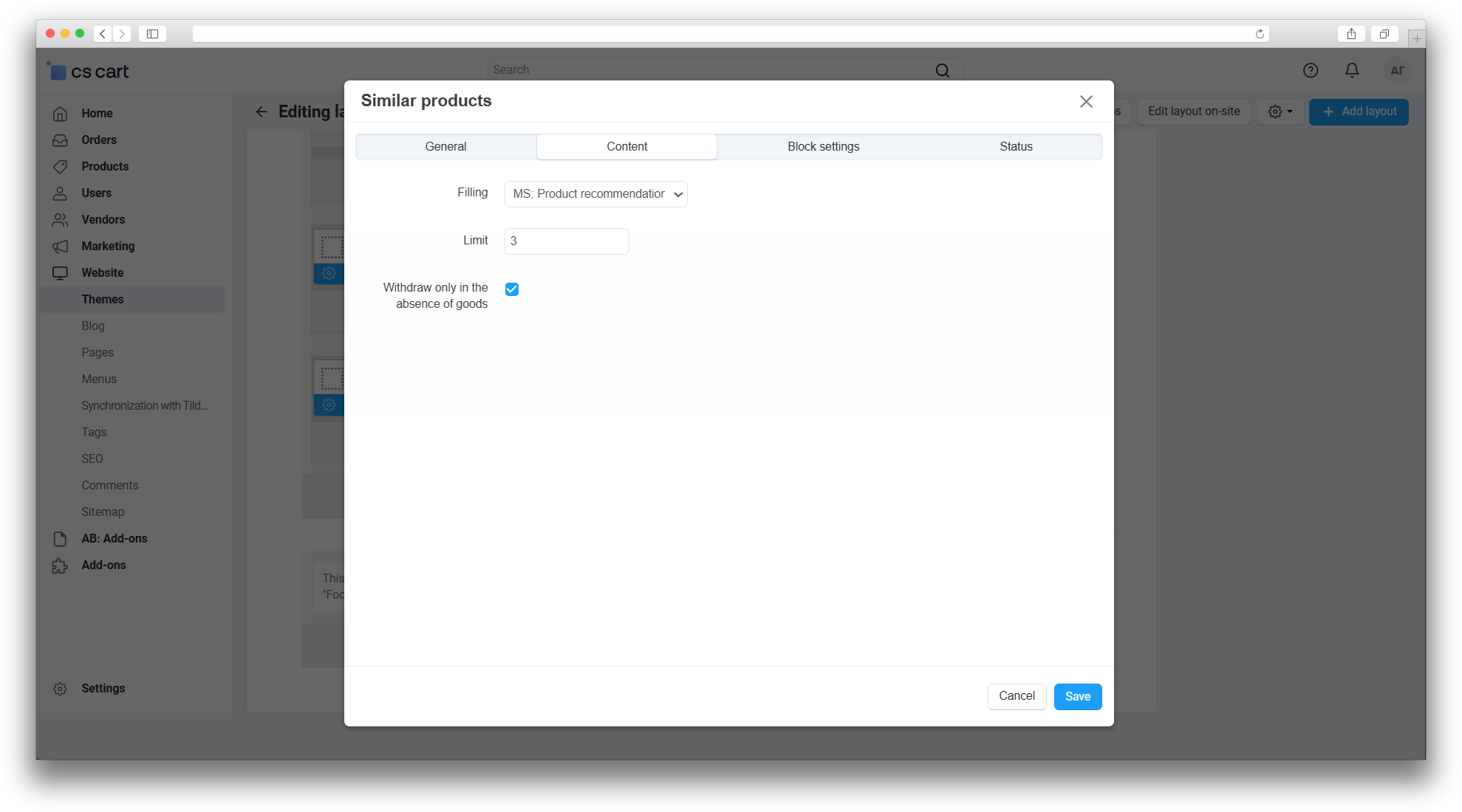 On the layouts page, select the «Products» page. In the section where you want to display product recommendations, click «+», then «Add block». After this, you will have two options: «Use existing block → Similar products» or «Create a new block → Products».