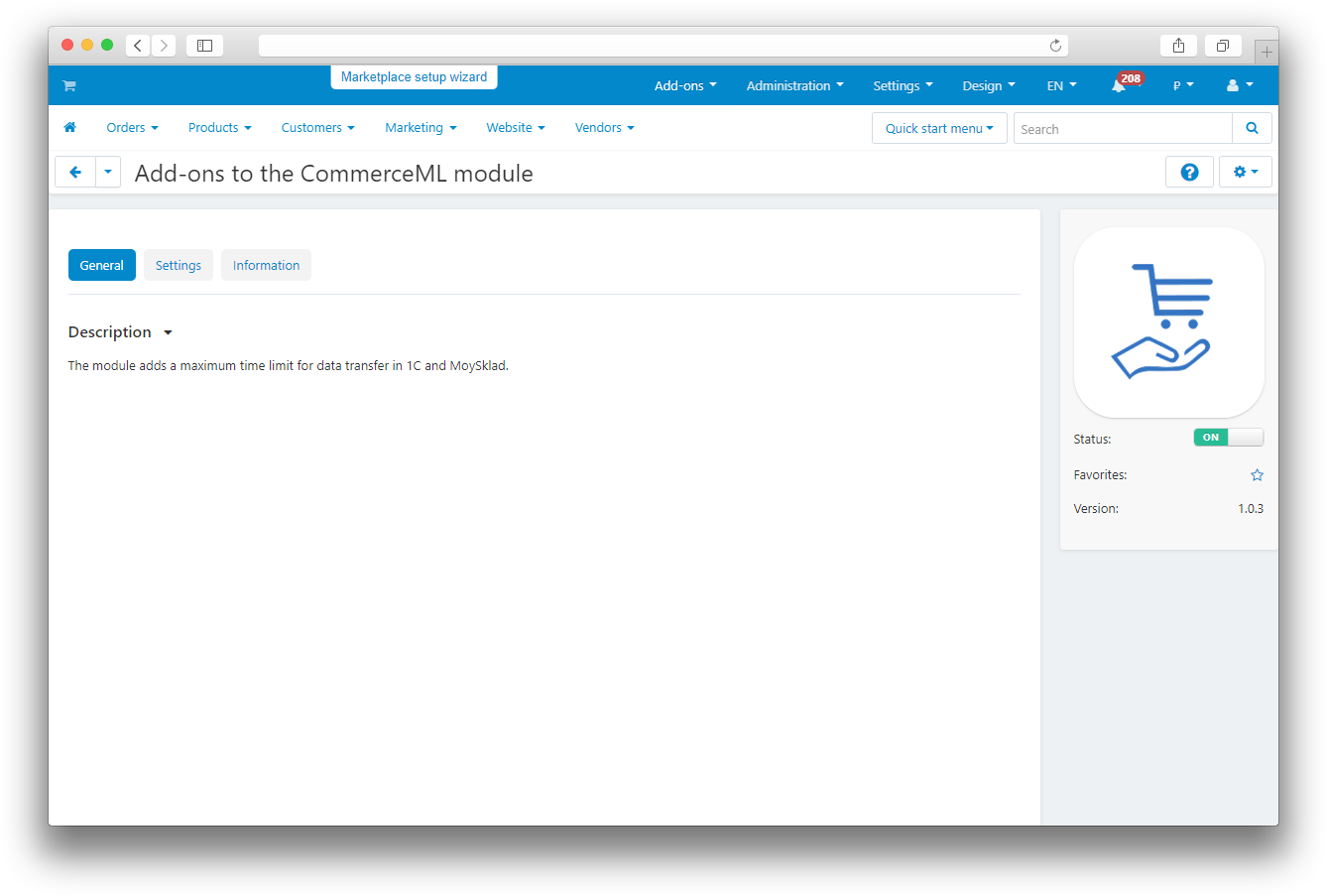 The add-on adds a setting for CommerceML exchange that sets the time after which the process message is sent. This message shows that the exchange is still going on and that there is no error.