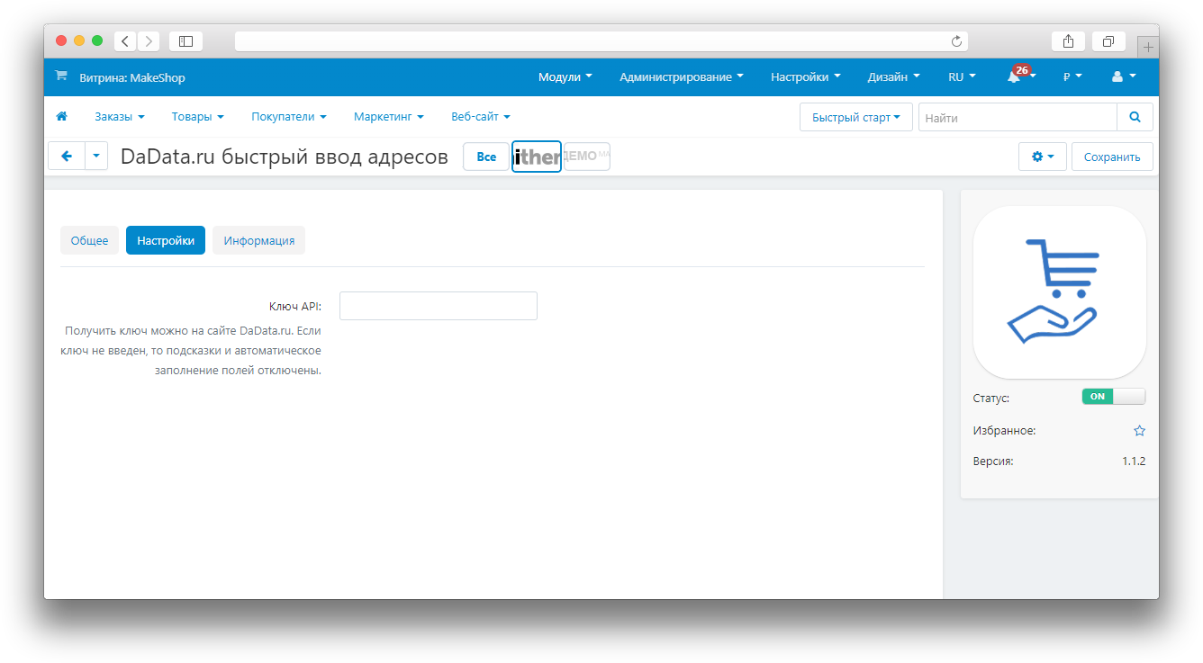 For work of the add-on after installation it is necessary to specify in settings the API-key for access to DaData.ru service (you can see it in your personal account https://dadata.ru/profile/)
