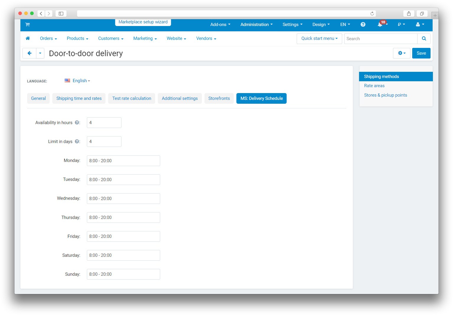 - Delivery hours for each day of the week - delivery intervals in hours can be specified for each delivery day. If there is no delivery on this day, the field is not filled.
