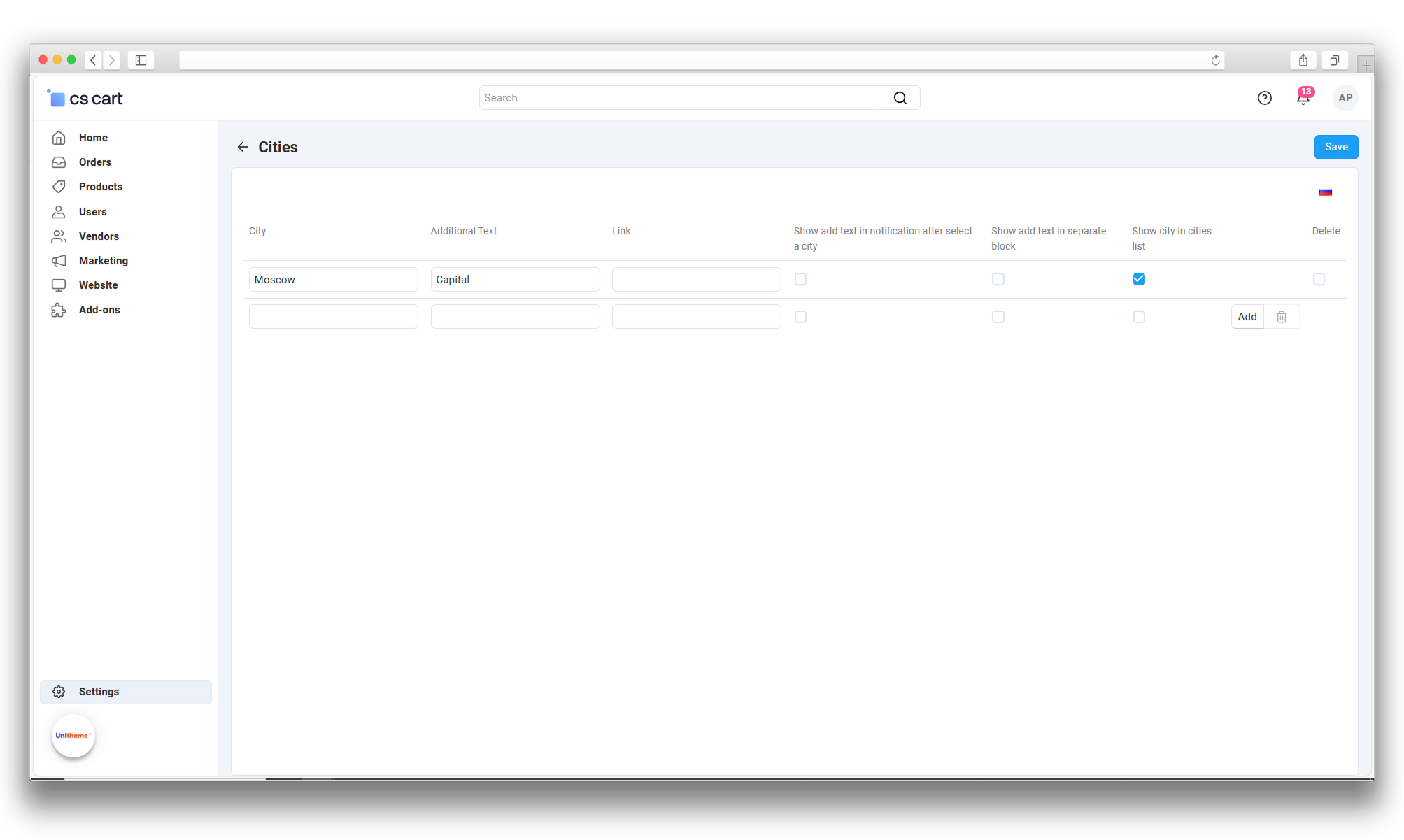 The add-on supports both automatically and manually created cities. In the settings, you can add explanatory text with HTML, set an alternative domain, enable display in the selection list and individual blocks, and show notifications after selecting a city.