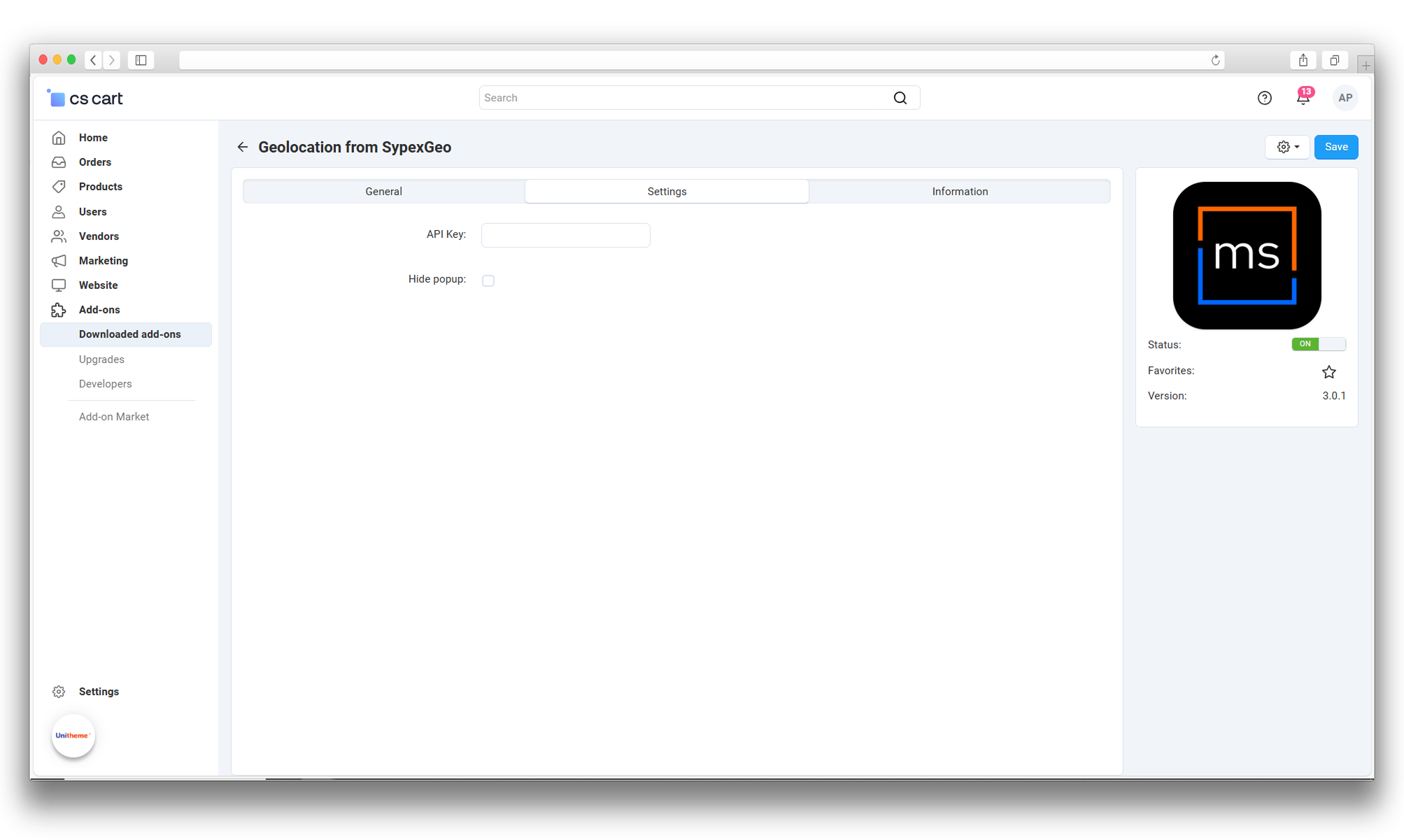 After installation, go to its settings. To do this, follow these steps: Administrator Panel → Add-ons→ Downloaded add-ons→ Geolocation from SypexGeo → Settings and activate the necessary parameters: