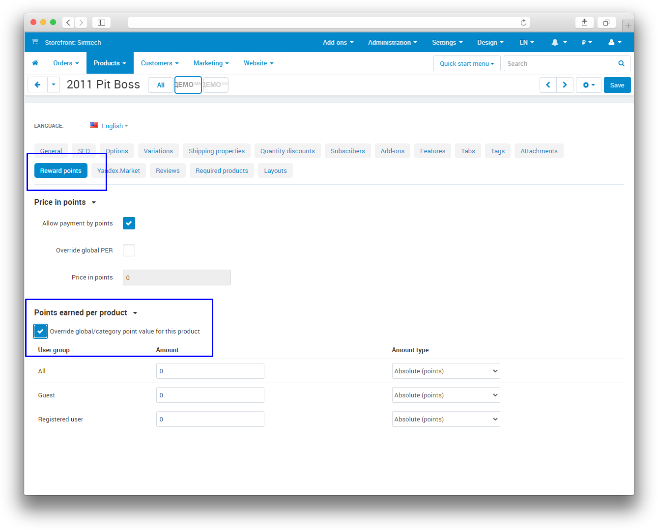 And for a specific product (applies only if you tick the Override global/category point value for this product).