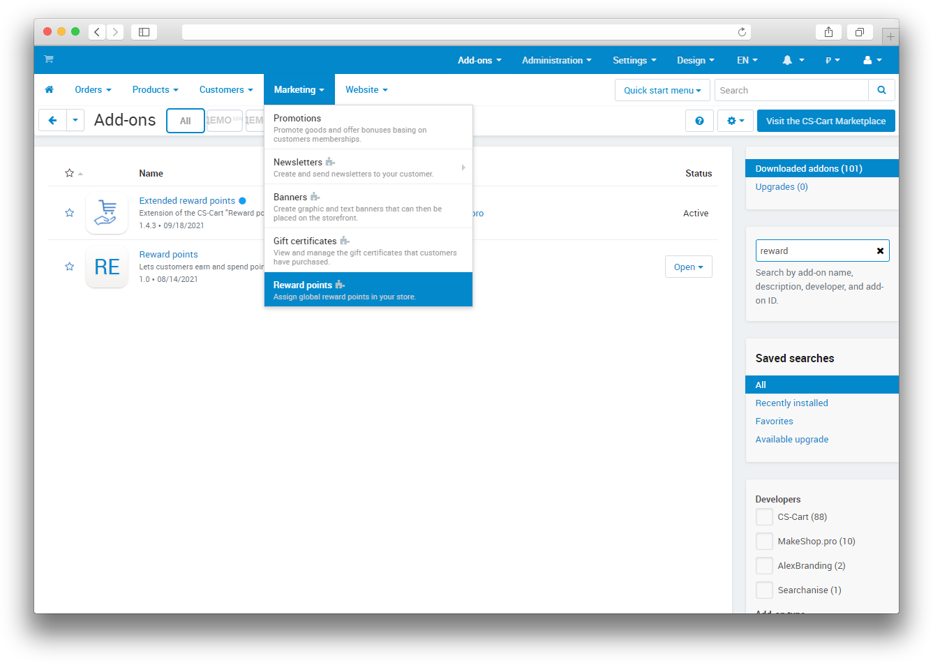 The standard CS-cart add-on is configured in Marketing → Reward Points.