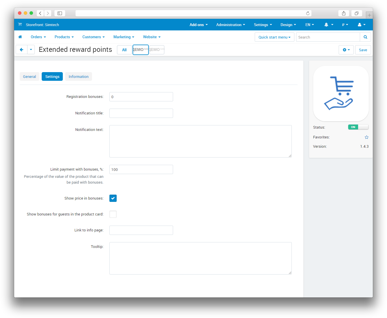 Registration bonuses - the number of bonuses accrued upon completion of registration.Notification title - the title of the notification, which is shown to the registrant after bonuses are accrued,.Notification text - the text of the notification that is shown to the registrant after the bonus has been accrued.Limit payment with bonuses,% - limitation of payment for goods with bonuses, specified as a percentage, global setting for the entire storefront.Show price in bonuses - show / hide the price in bonuses in the product card.Show bonuses for guests in the product card - show in the product card the number of bonuses accrued for a purchase for unregistered users (Guests group).