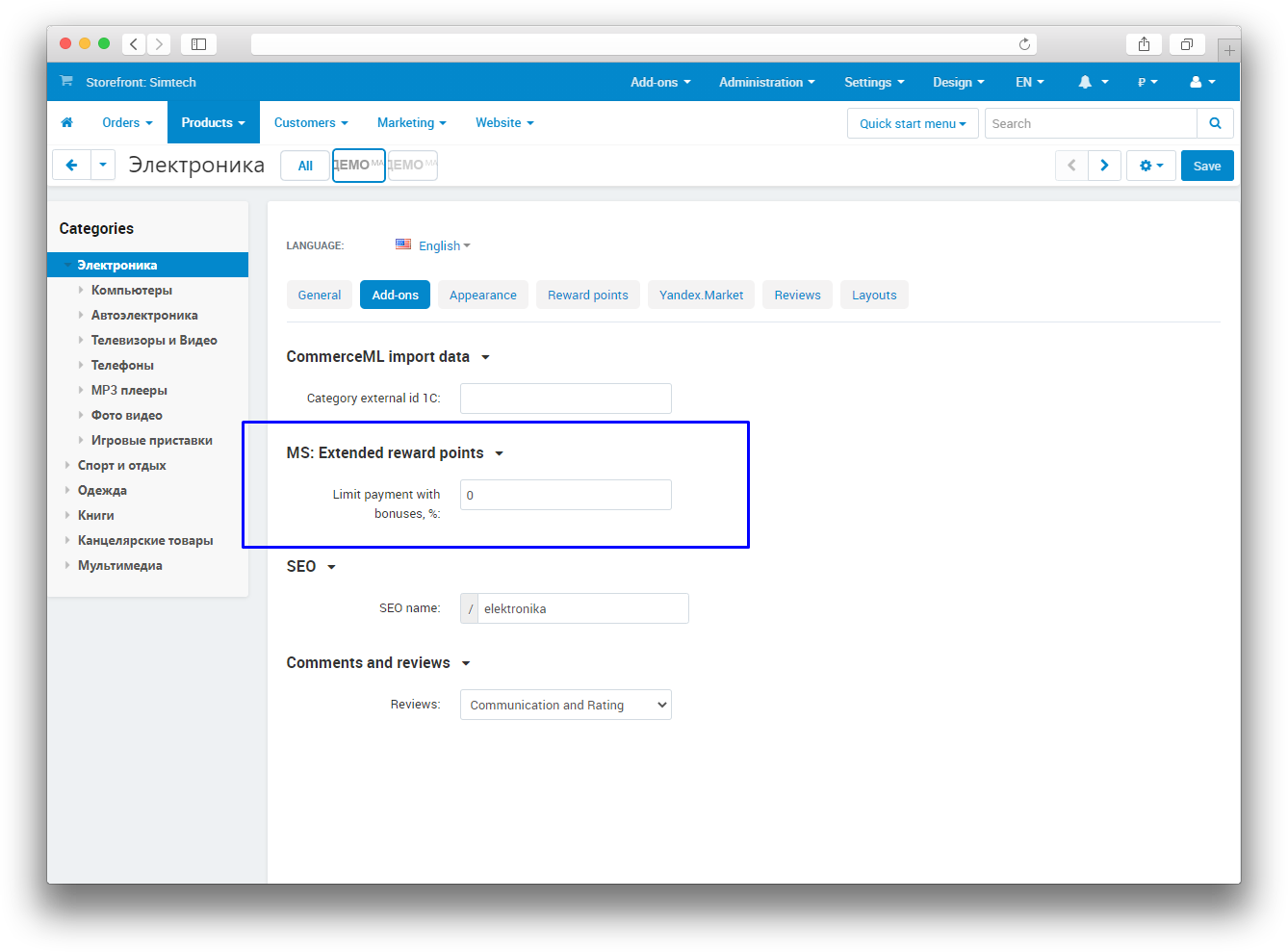 - Setting the percentage of the price of a product, which can be paid with bonuses (with the ability to specify your percentages for certain categories and / or products).