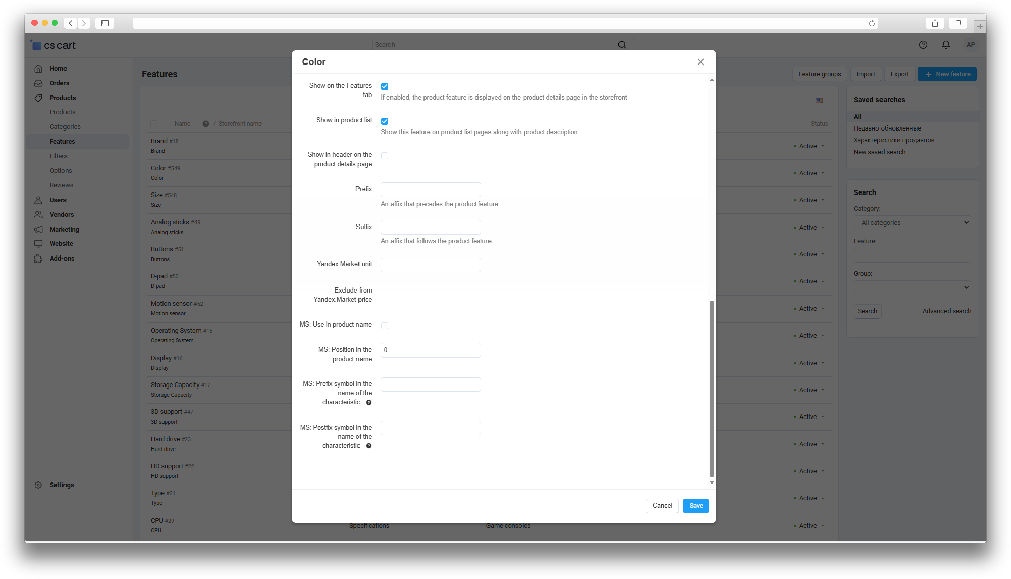 To use a feature in the name, you need to check the box MS: Use in product name in the feature settings first. To do this, follow these steps: Admin Panel → Products → Features, go to the necessary feature and activate the required parameters: