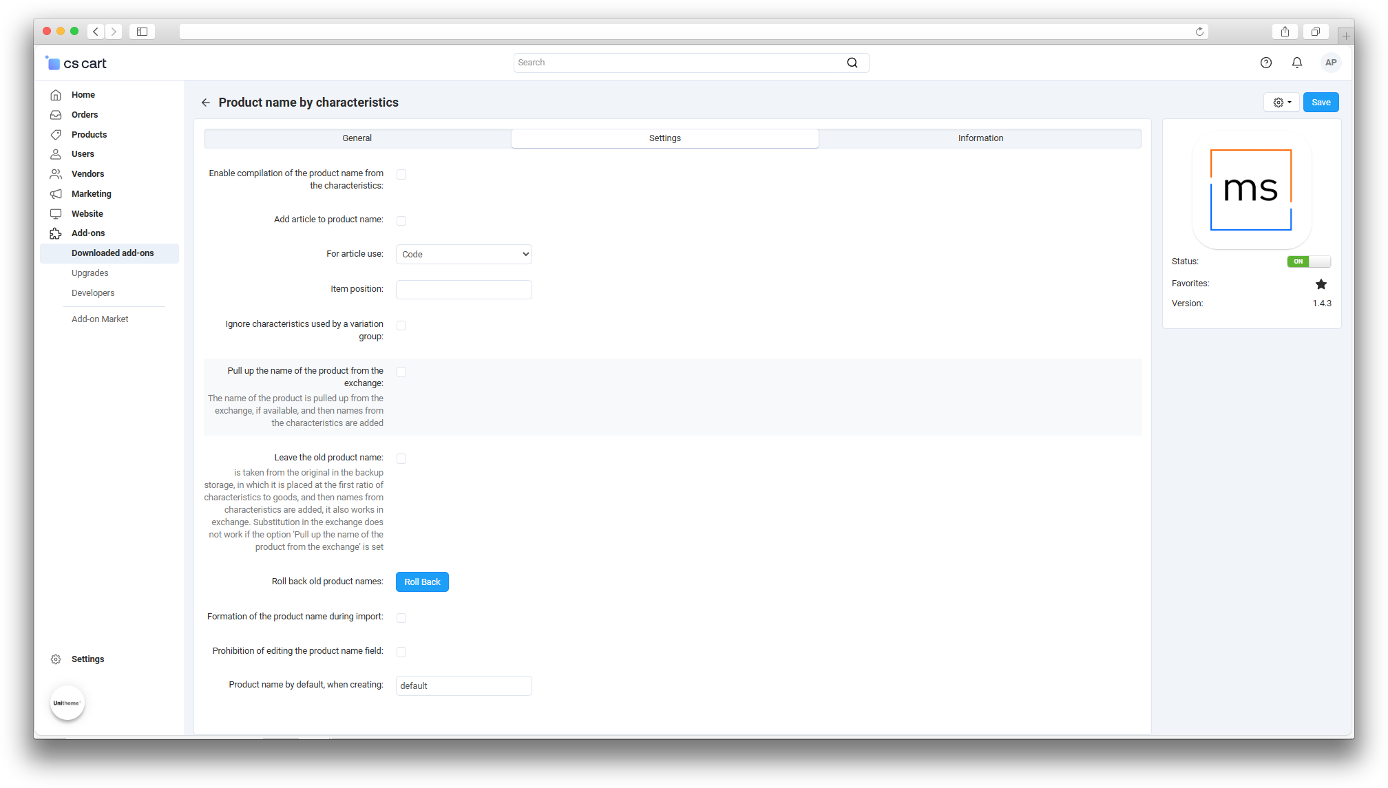 The add-on also supports automation of product name management, including options such as pulling names from external exchange systems, saving the old name with the addition of characteristics. There are functions for rolling back to old names, automatic generation of names when importing data, blocking manual editing and setting a template for default names. These tools provide flexibility, convenience and accuracy in working with large product catalogs.