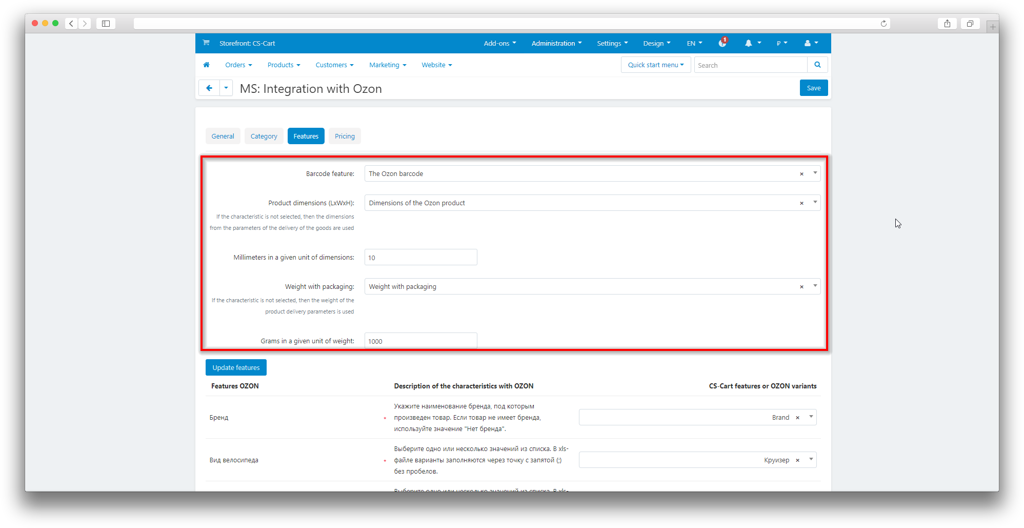 In this field, you can compare the Weight of the Ozon product with the CS-Cart features