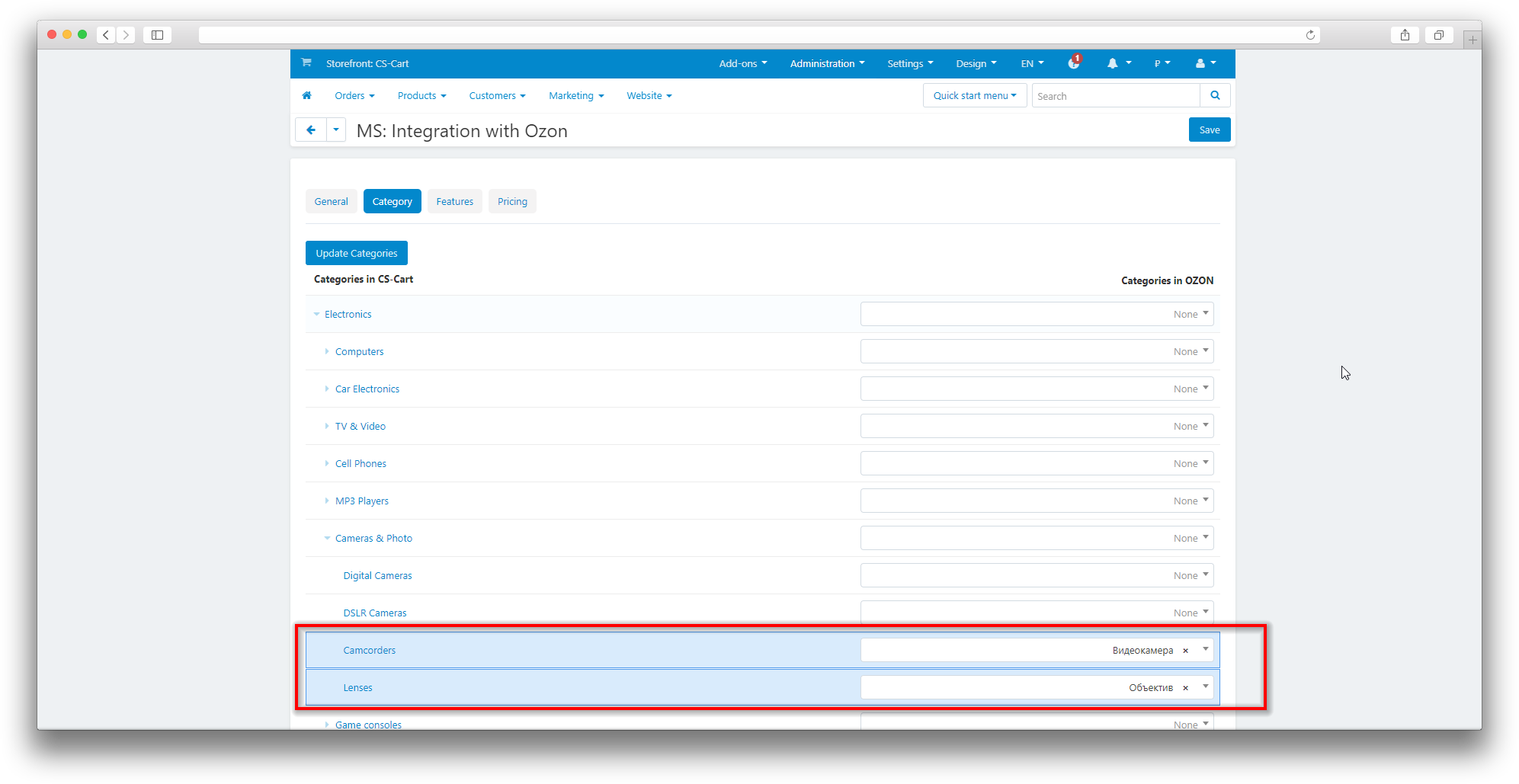 - Loading categories from Ozon for easy comparison with categories in CS-Cart;