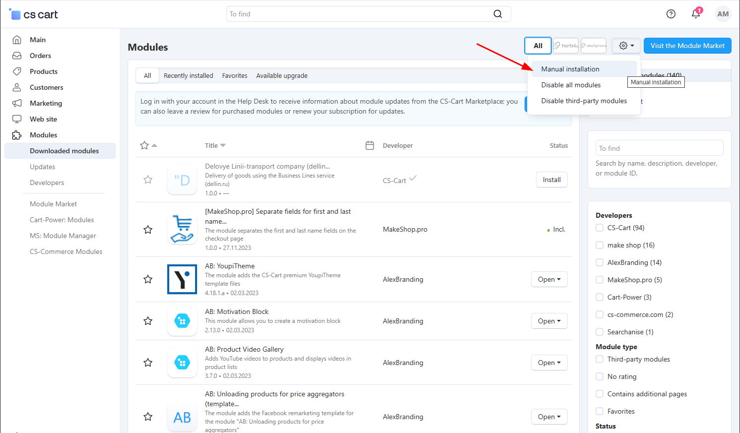 For CS-Cart version higher than 4.18.1, the Admin Panel → → Add-ons Downloaded add-ons → Gear button → Manual installation.