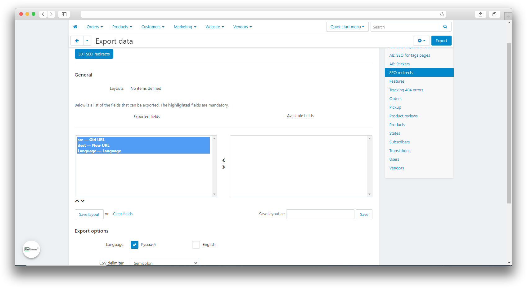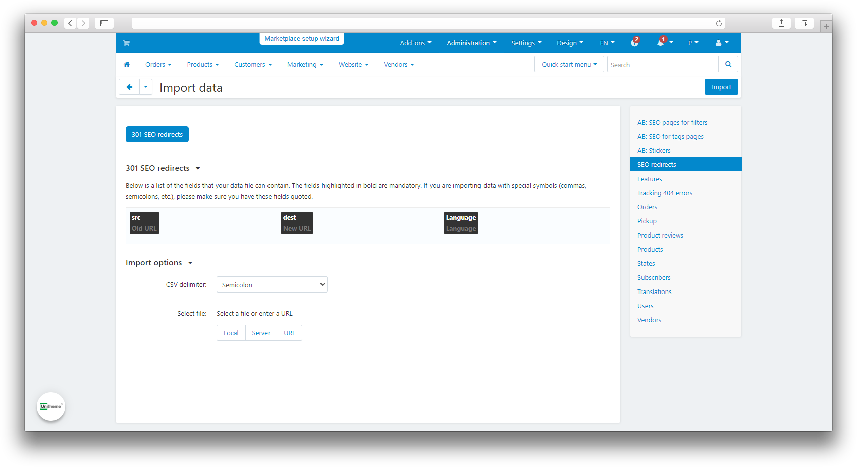 The add-on provides the ability to export and import lists of redirects in CS-Cart, and is necessary for mass work with links on the site. It allows for quick and easy management of the list of redirects, exporting and importing lists, which simplifies the process of transferring a site from one CMS to another, changing URL addresses of pages, and other tasks.