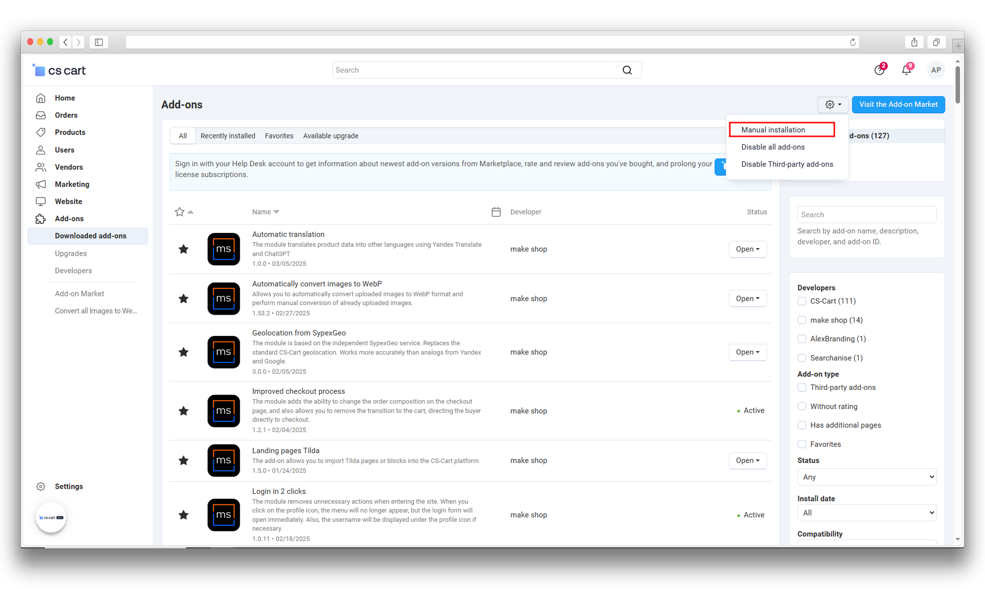 After downloading the add-on, install it using the standard CS-Cart tools on the page Admin Panel → Add-ons→ Manage Add-ons → Upload and Install Add-on (+).