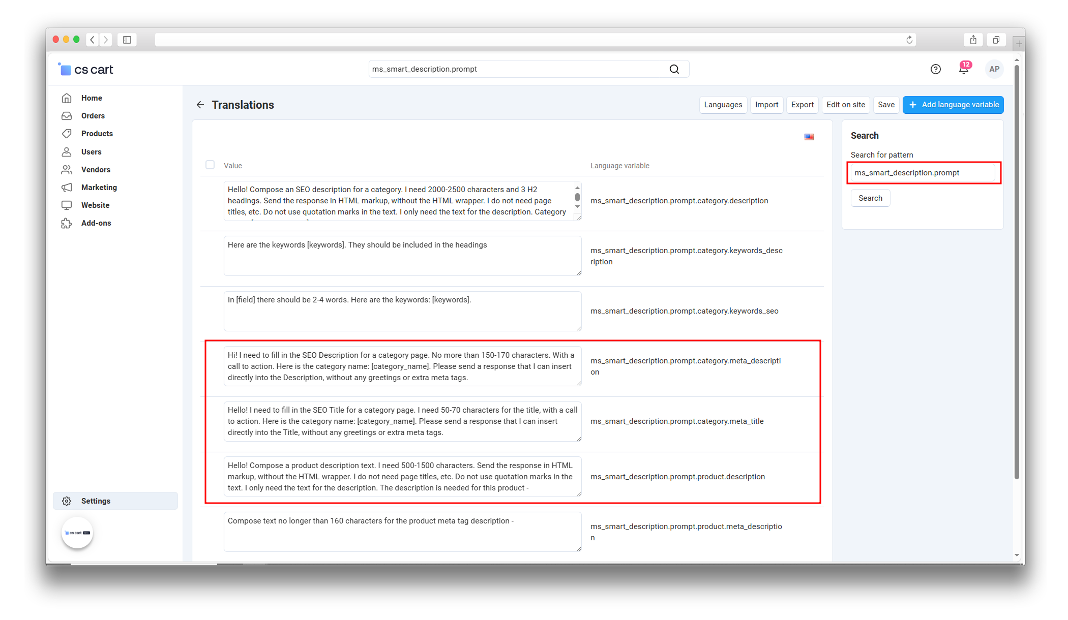 One of the unique features of the add-on is the prompt editing function, which allows you to personalize the requests for content generation according to your needs. This gives you full flexibility in customizing the text that will be generated for products, categories, and SEO descriptions.