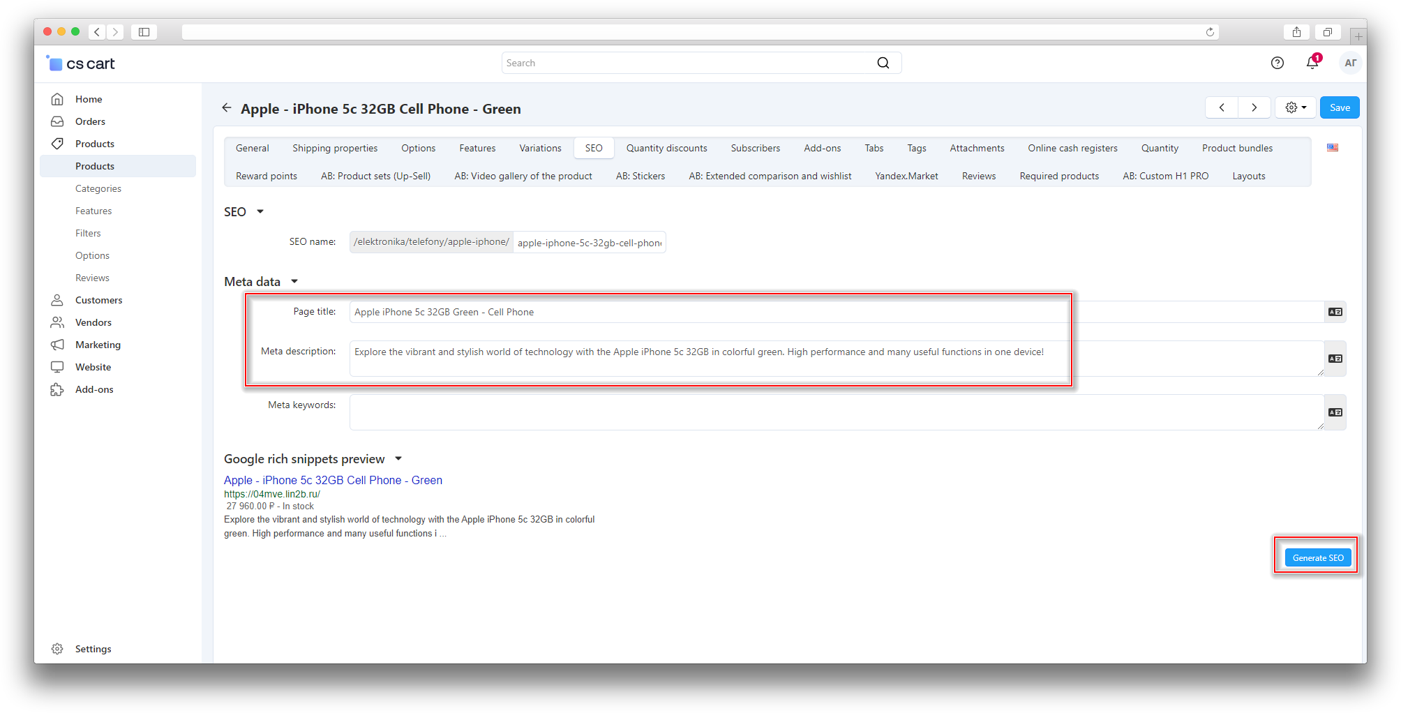 [+] Added the ability to generate meta tags for products