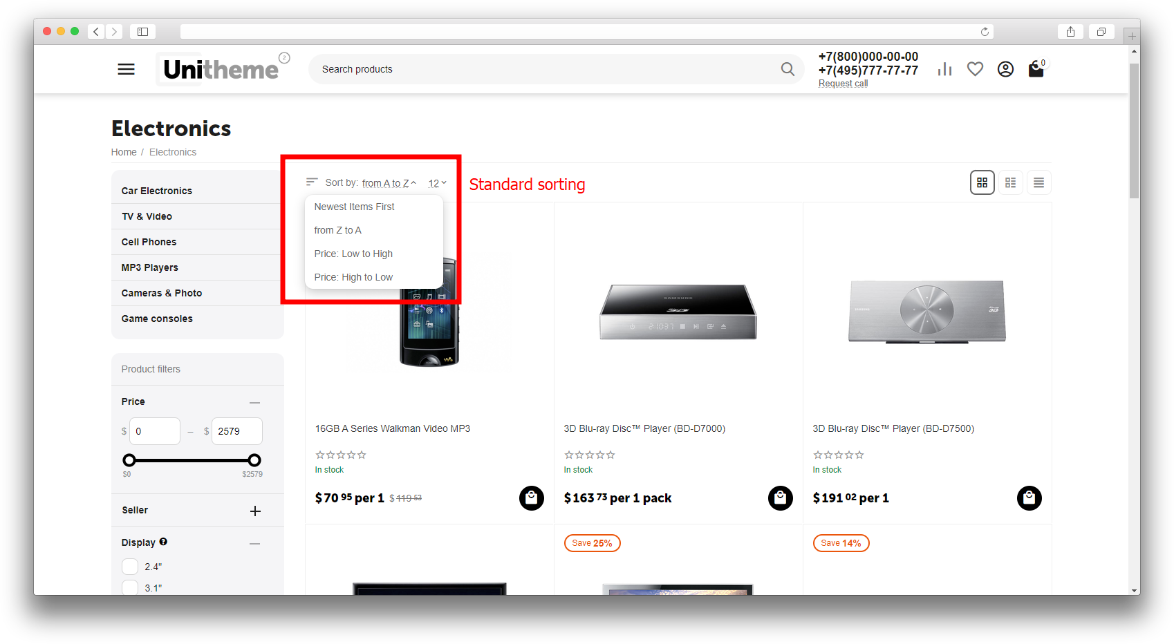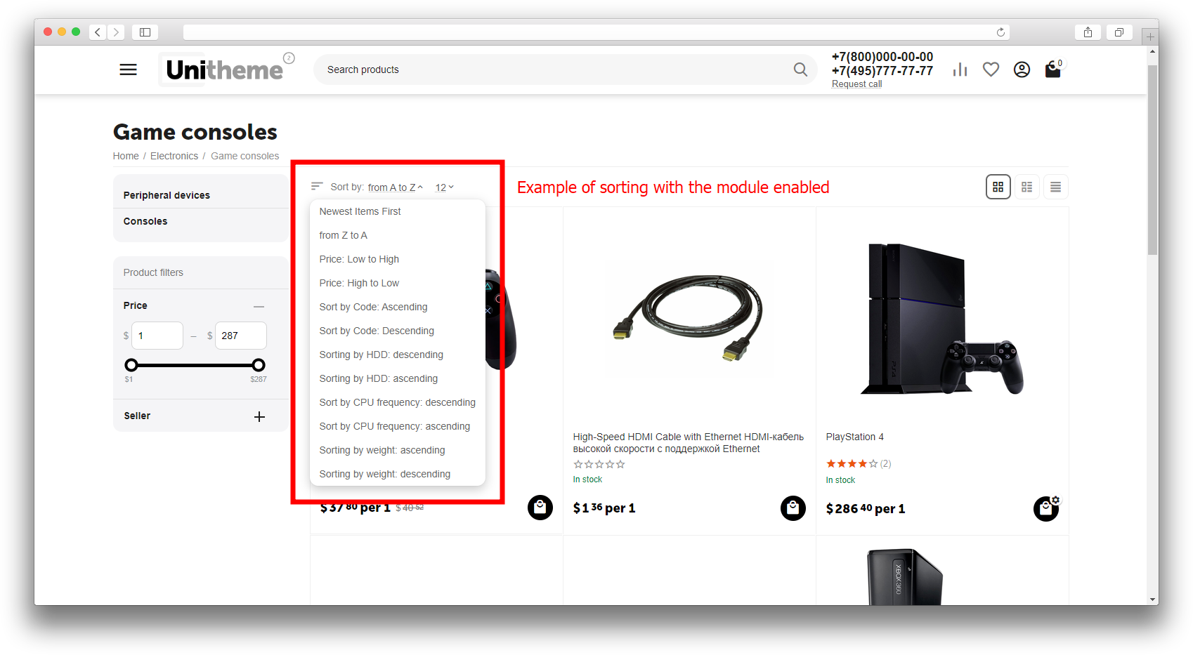 The add-on allows you to sort products by any characteristic and expands the possibilities of sorting products in your online store. Now you can add sorting by code, article, or any other product characteristic. This speeds up the search for the desired product and improves the user experience. The module also allows you to take into account the availability of the product and display first those products that are in stock.