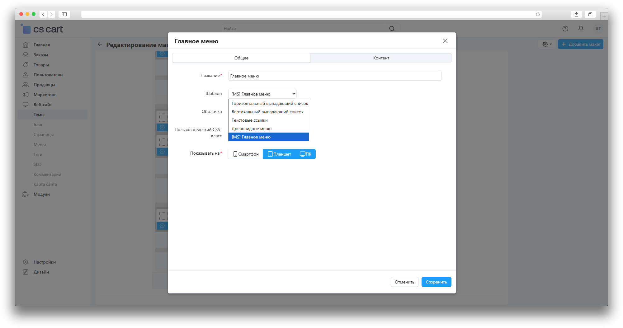 As a result, the following menu will appear on the site: