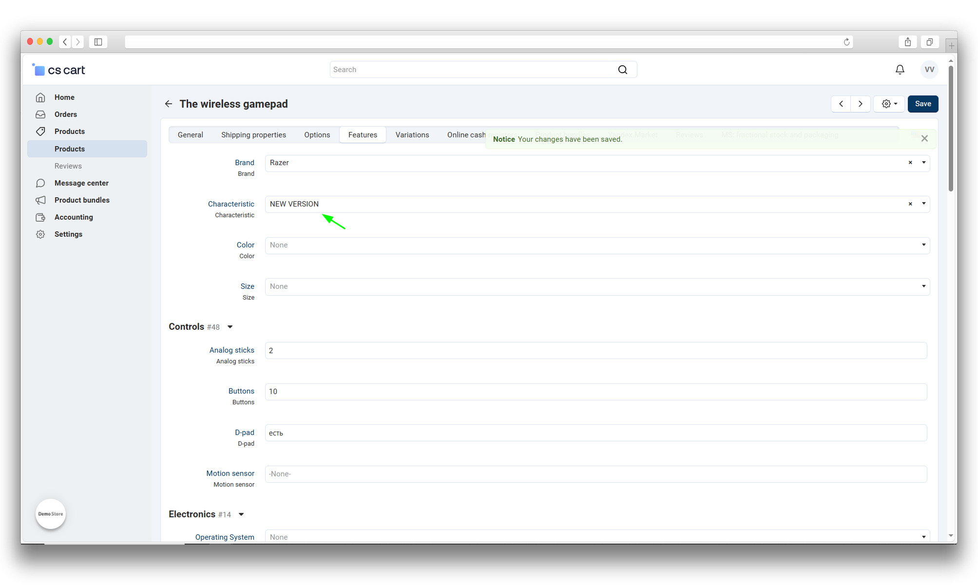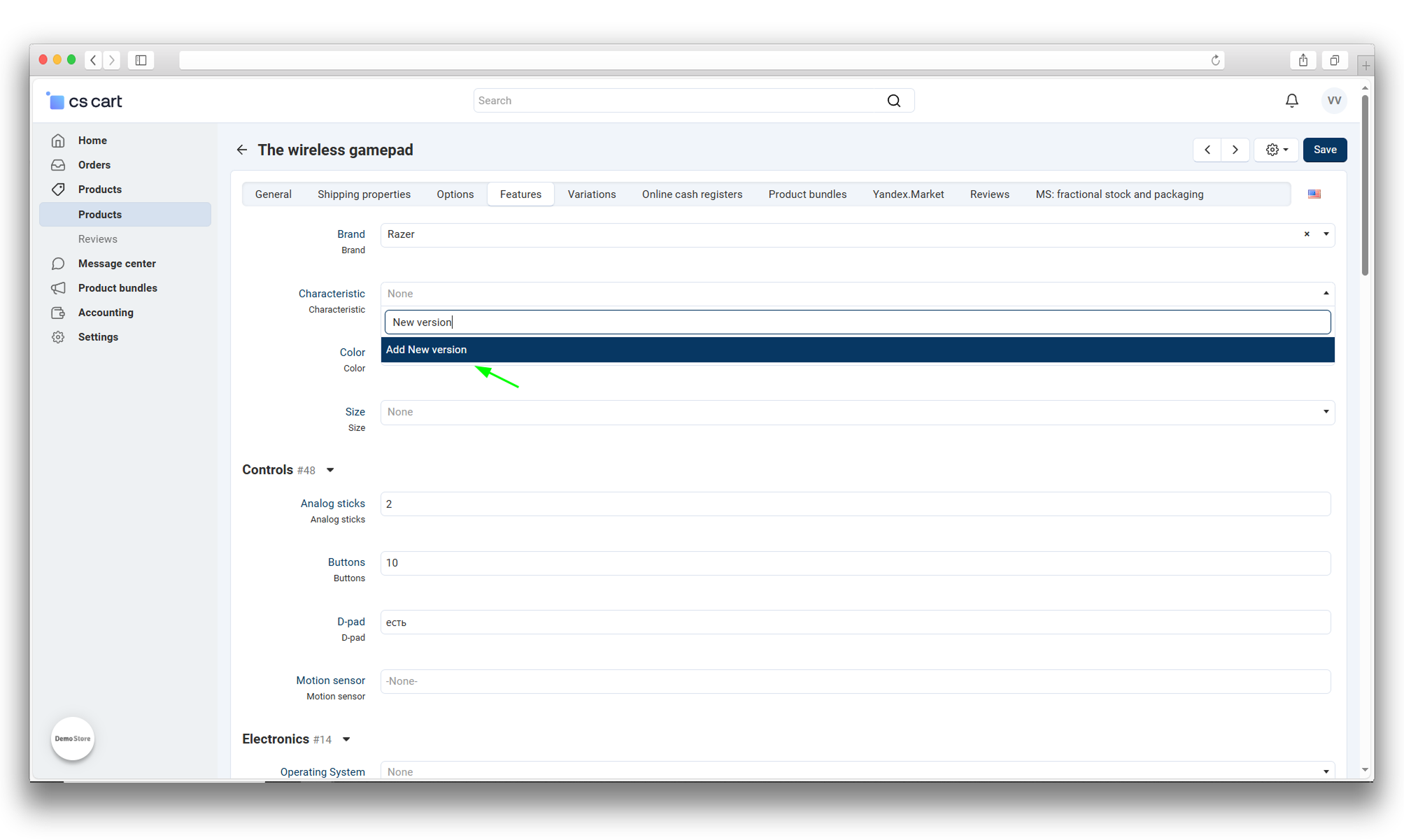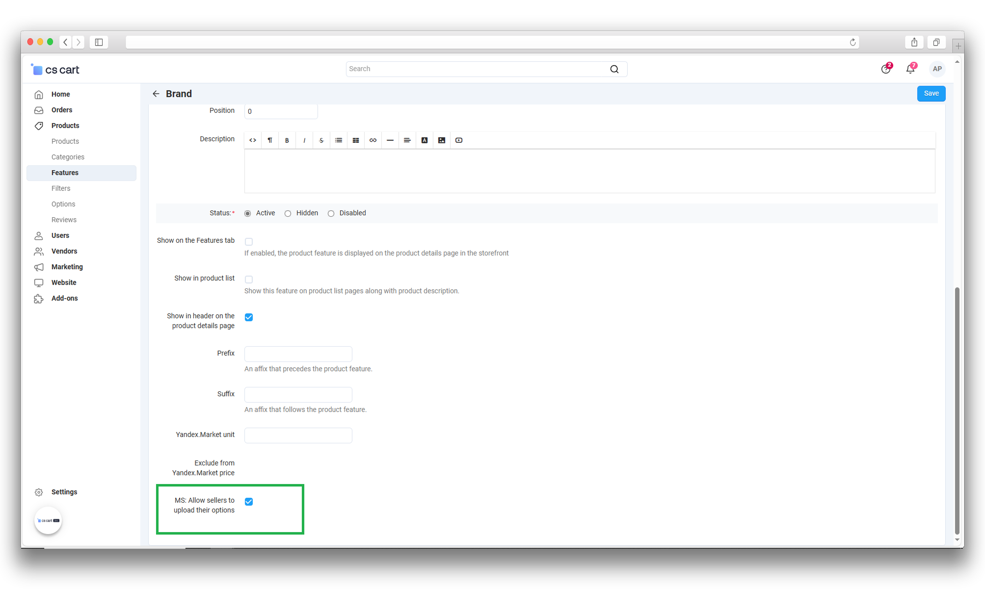 Next, you need to allow for which characteristics sellers will be able to add new values. To do this, follow these steps: Administrator Panel → Products → Features, go to the required characteristic and activate this parameter: