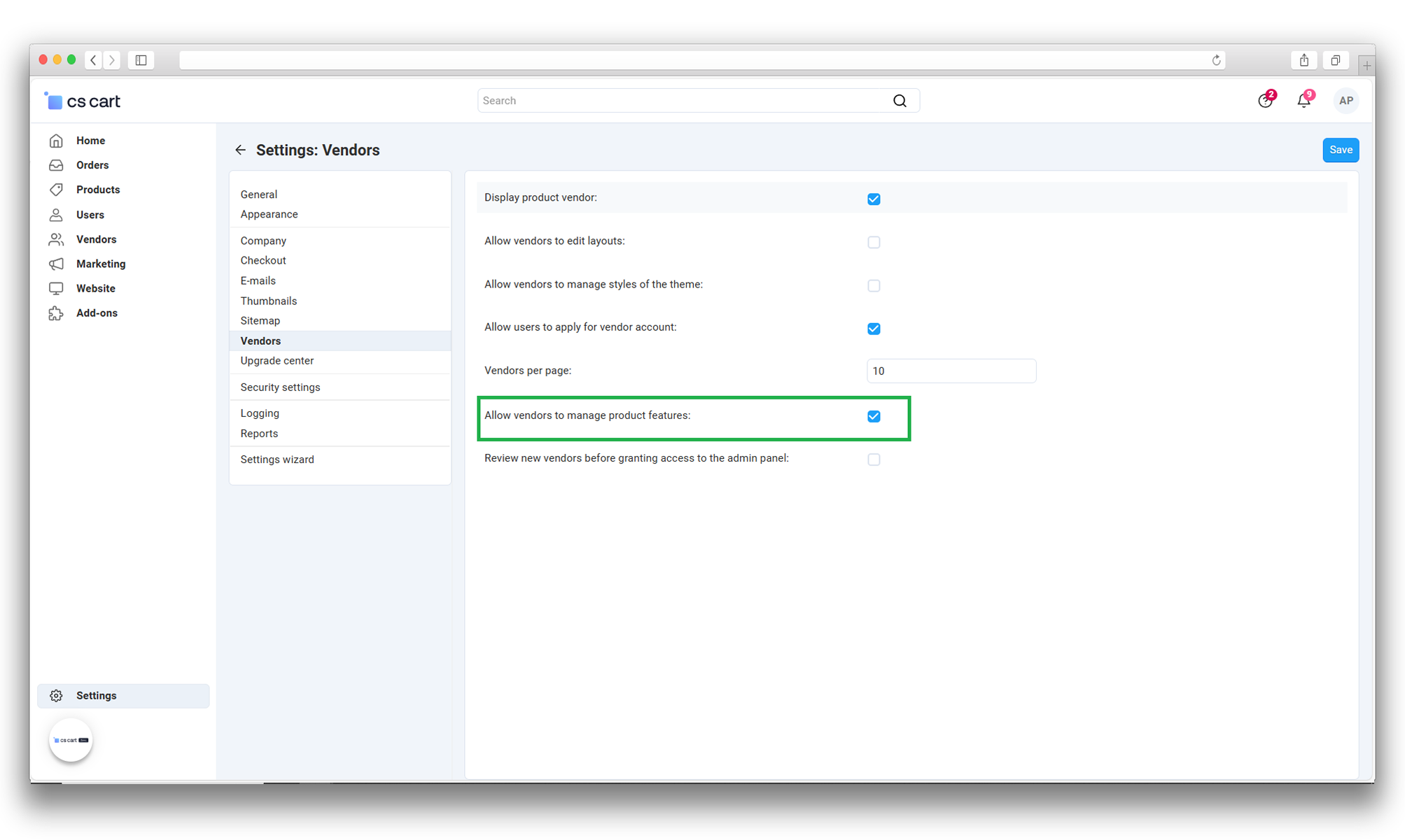 - After installation, you need to activate the “Allow vendors to manage product features” parameter. To do this, go to Admin Panel → Settings → General → Vendors and check the corresponding checkbox: