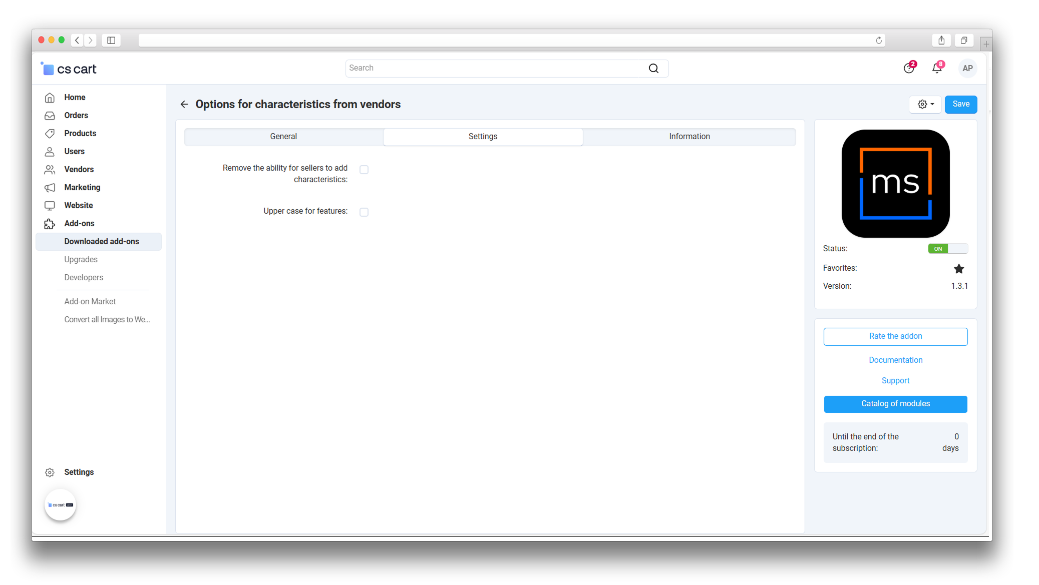 Then we proceed to configuring the add-on. To do this, follow these steps: Administrator Panel → Add-ons → Downloaded add-ons → Options for characteristics from vendors → Settings and activate the necessary parameters: