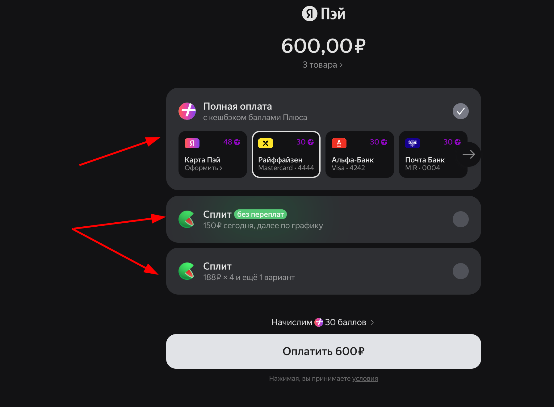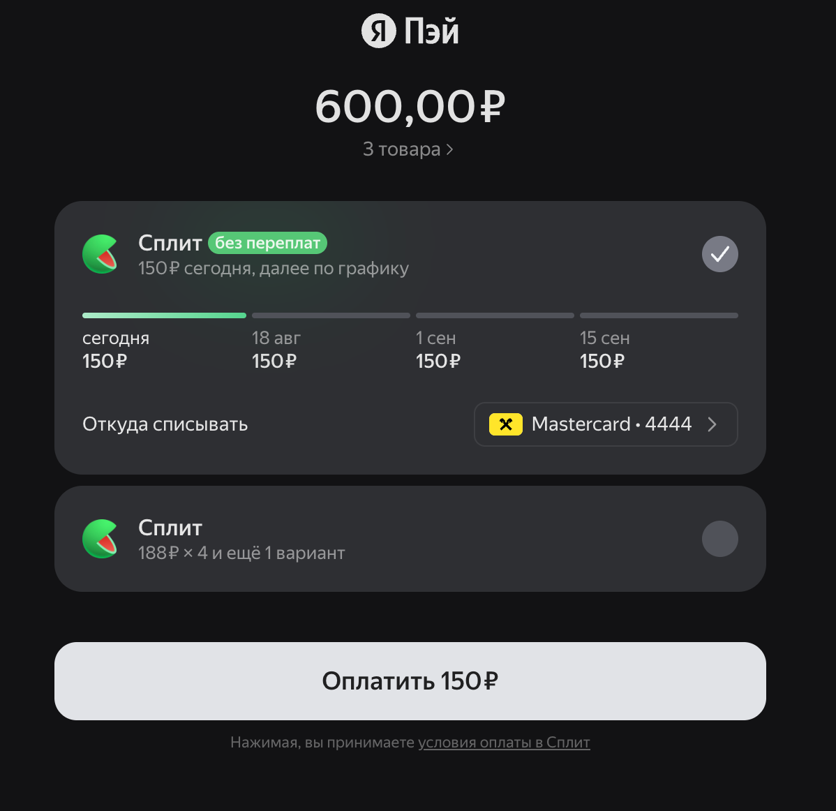 CARD + SPLIT – The customer will be able to choose either Yandex Pay or Split on the same screen.