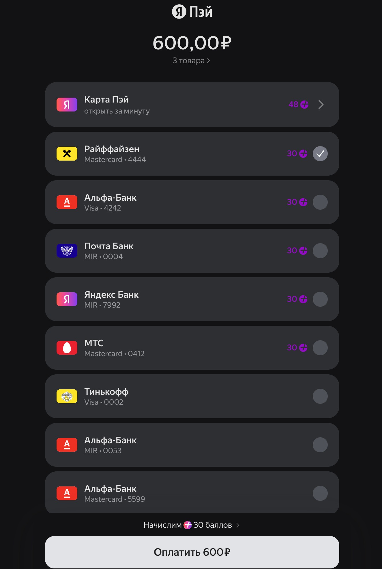 - Yandex Pay — one-click payment. The customer confirms the purchase instantly — all payment details are pulled from their Yandex account.