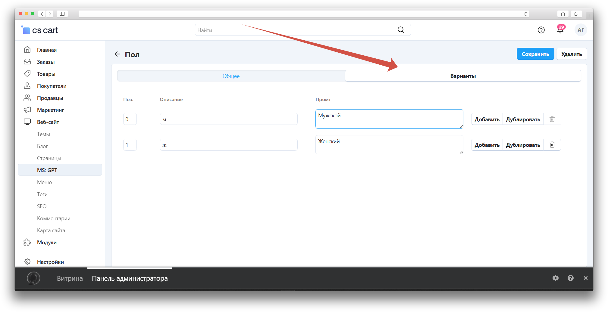 После сохранения, рядом появится новая вкладка «Варианты», тут мы можем их указать.