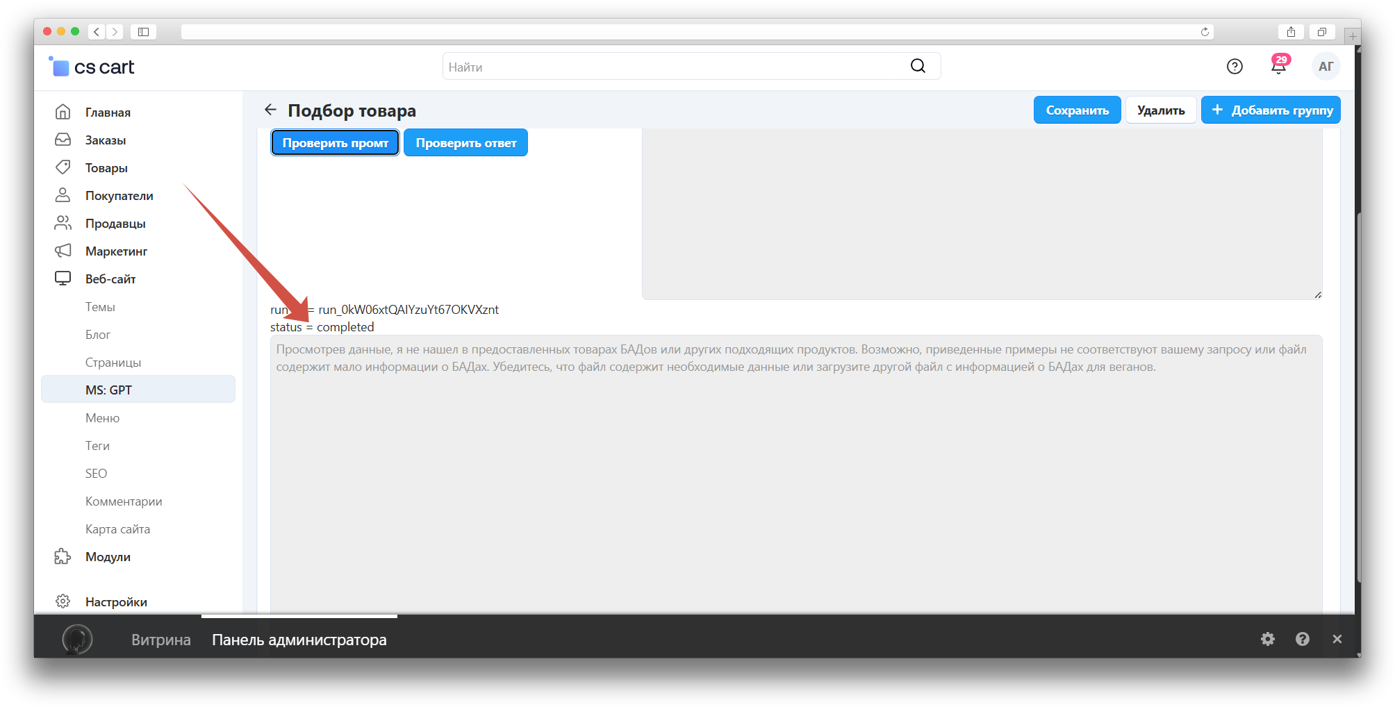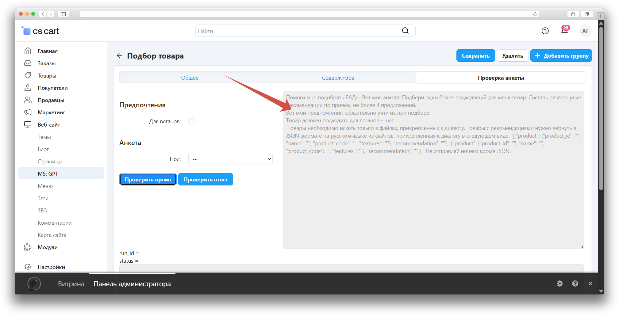 Тут можно посмотреть какой промпт в итоге отправляется в GPT, а также посмотреть какой формируется ответ.