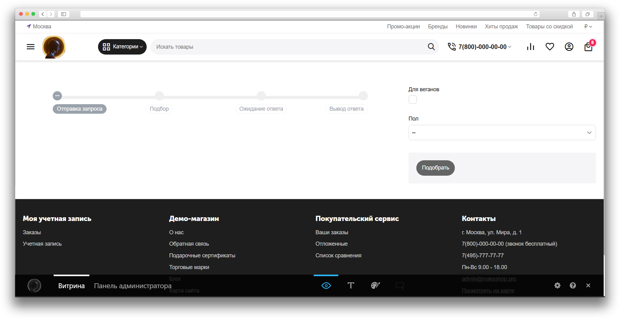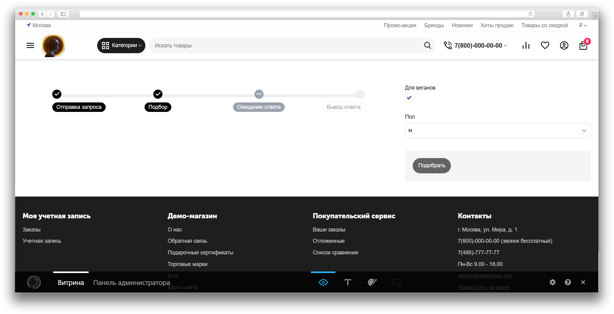 На витрине появляется интерактивная форма. Пользователь заполняет анкету, нажимает «Подобрать», и получает результат с рекомендациями и товарами от ChatGPT. Ответ от ChatGPT может занять какое-то время.
