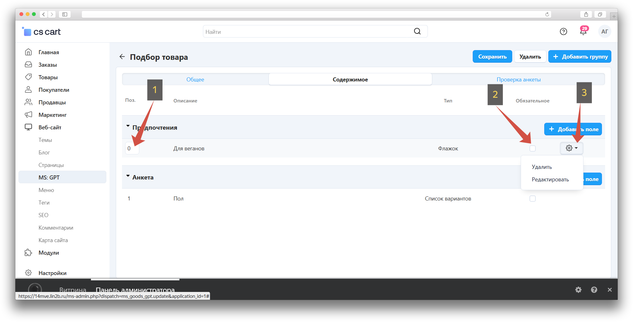 В Контент указываем нужную анкету.