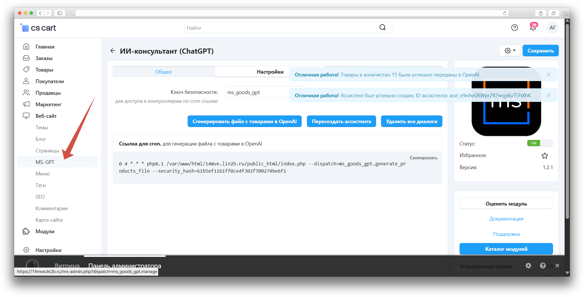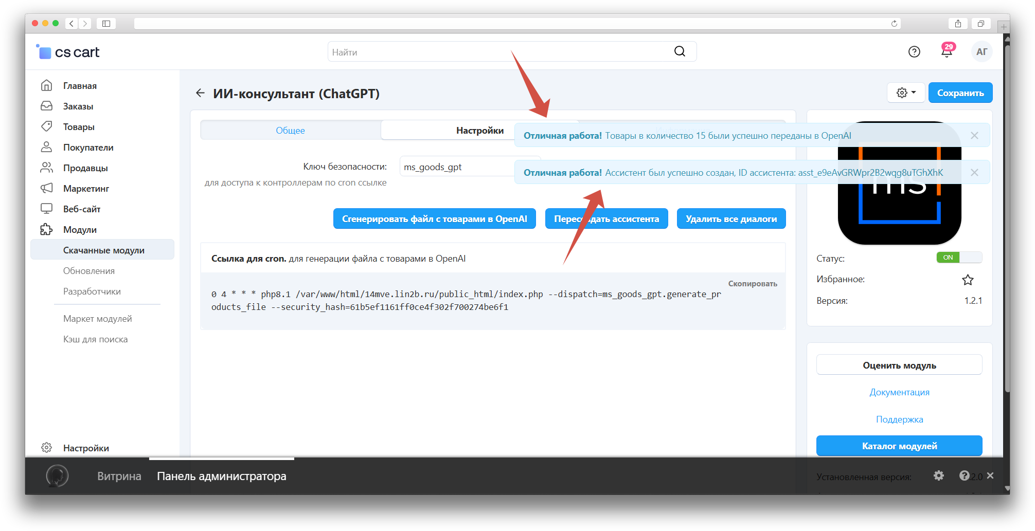 - Нажмите «Сгенерировать файлы» — товары отправятся в OpenAI, создастся ID ассистента.