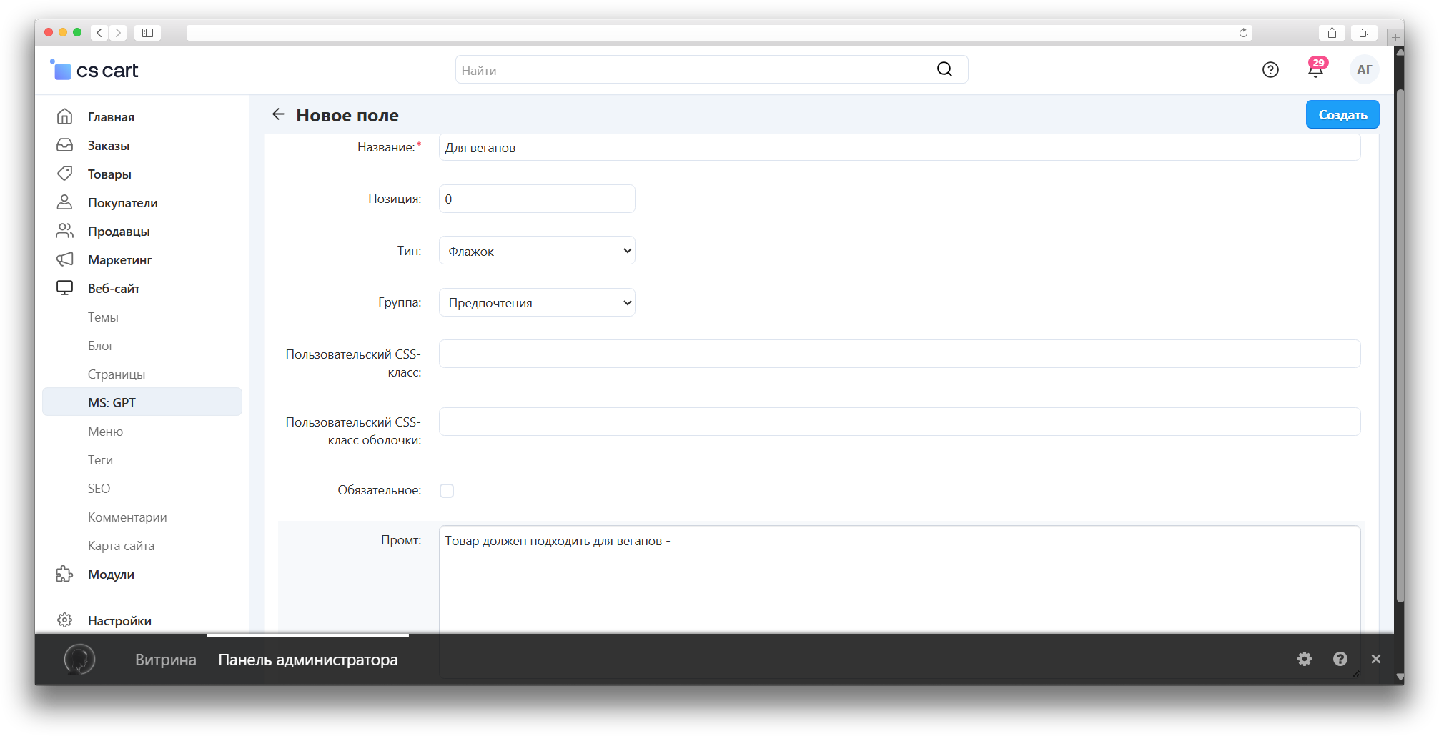 - Создать и разместить ссылку на страницу на витрине.