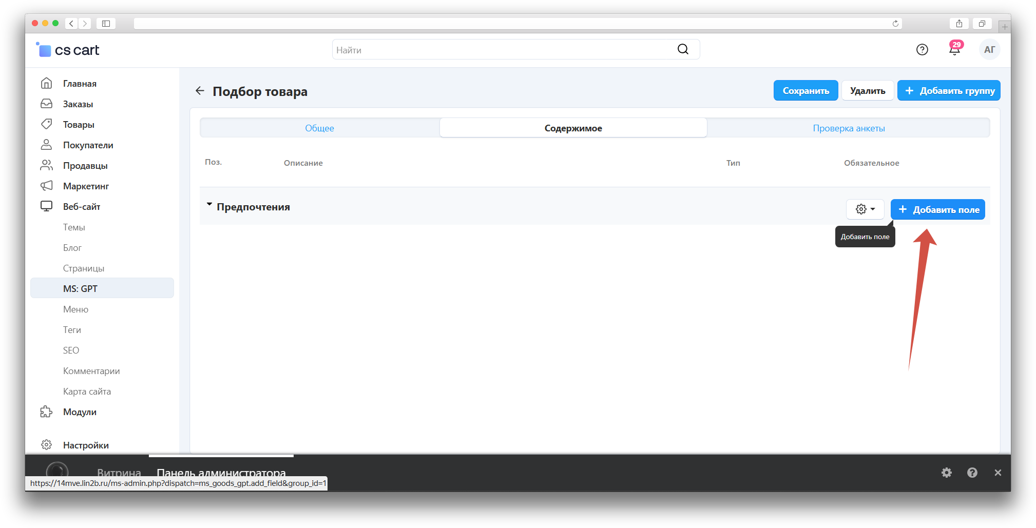 Нажмите на появившуюся также кнопку «Добавить группу», это нужно чтобы создавать вариации обращений к GPT, с различными промптами и параметрами (полями).