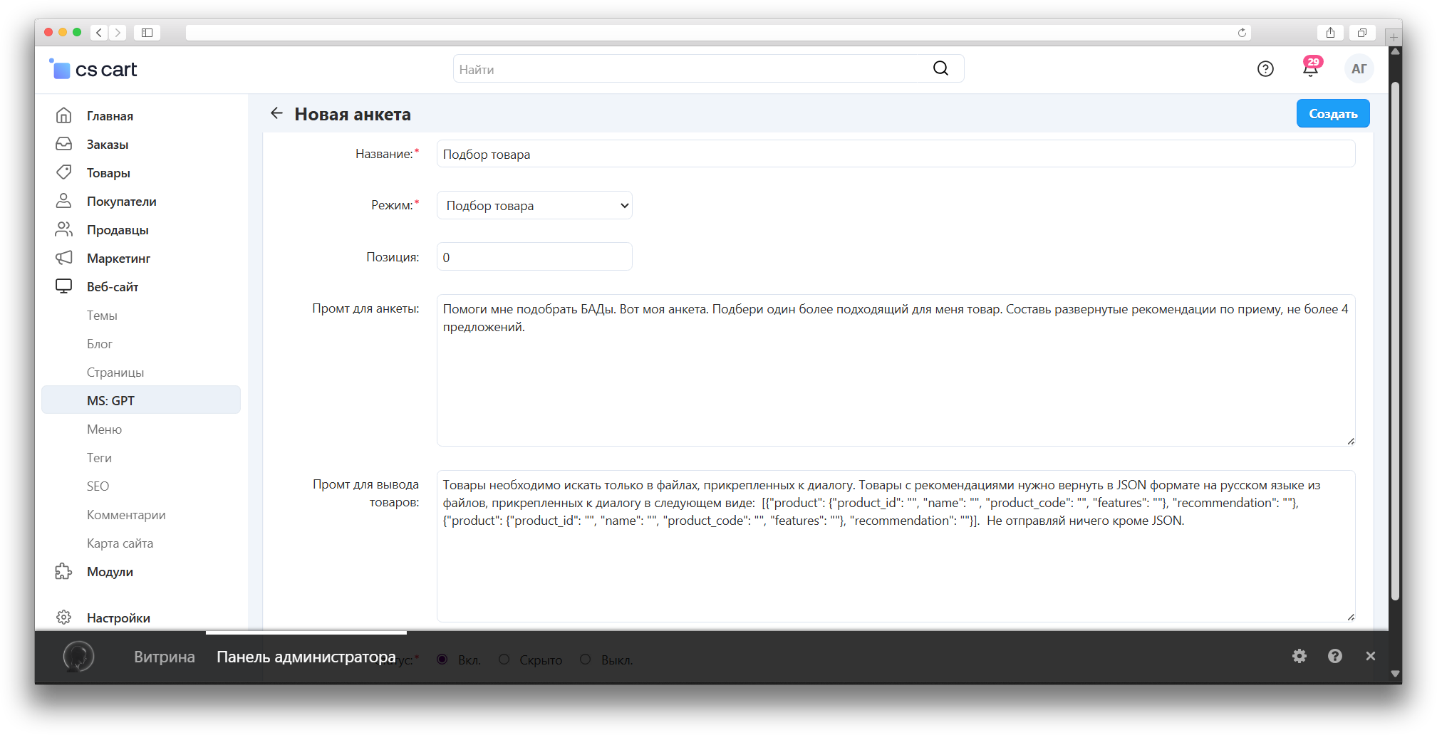 Укажите позицию отображения анкеты и при необходимости — стартовый prompt.