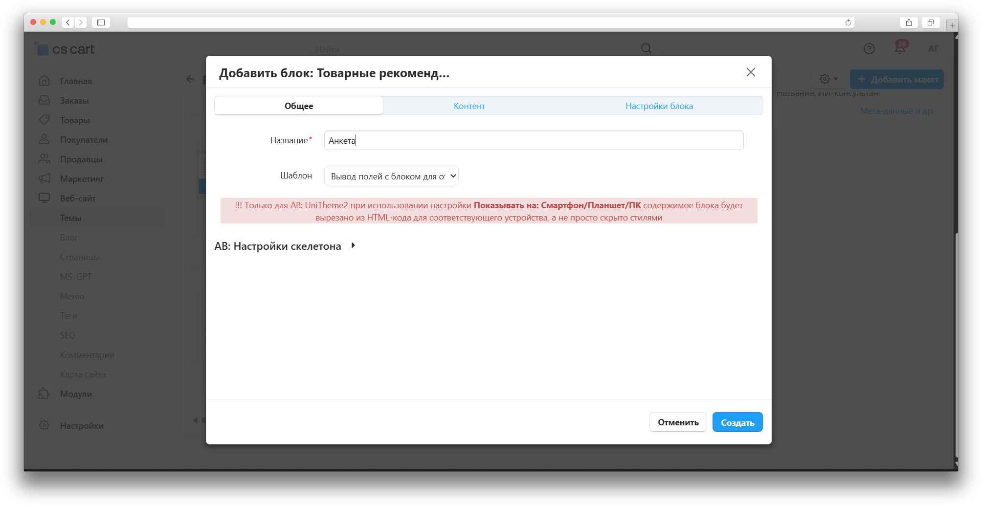 Настройки блока по необходимости.