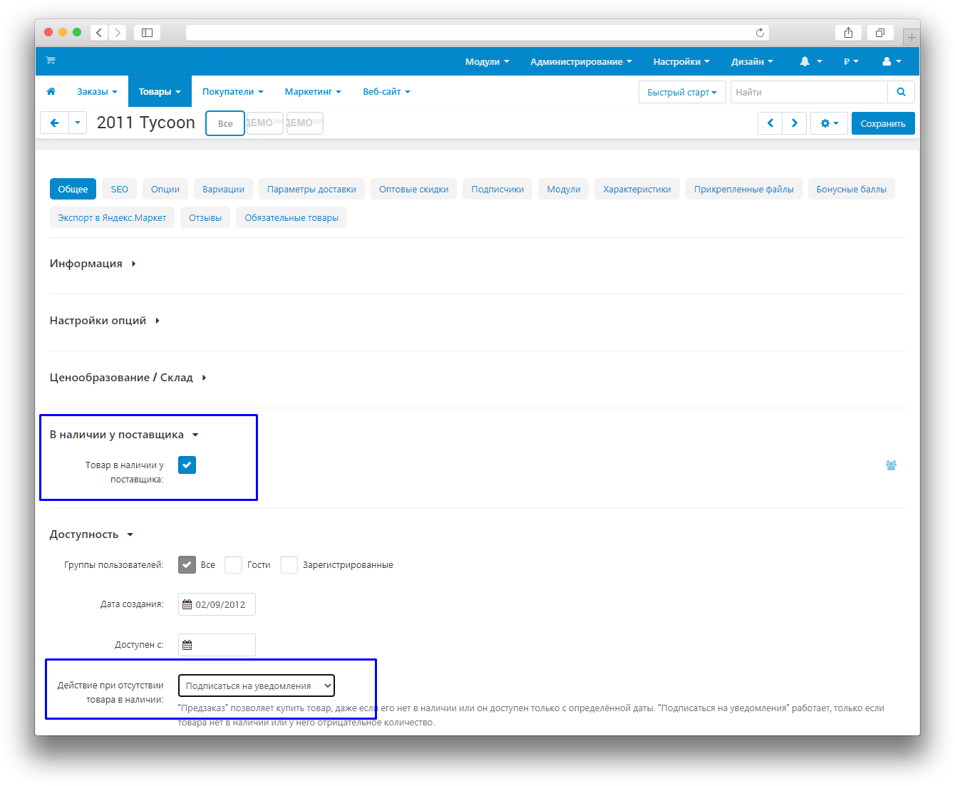 Настройки для витрин по умолчанию - Ставить или не ставить галочку В наличии у поставщика в свойствах нового товара.