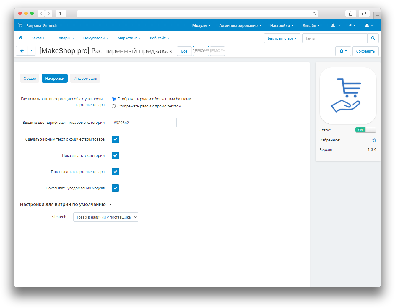 - Модули → Управление модулями → Предзаказ у поставщика — настройки отображения.