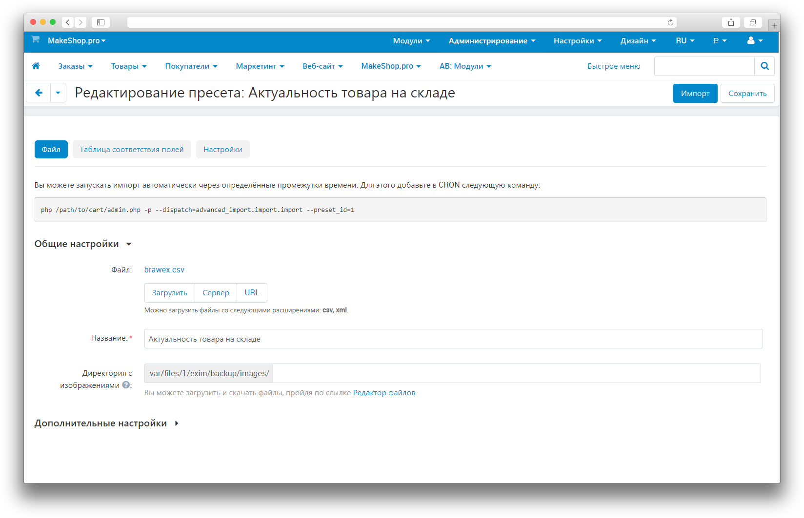 На странице редактирования пресета укажите имя шаблона и файл для импорта, в CSV формата. Сохраните шаблон.
