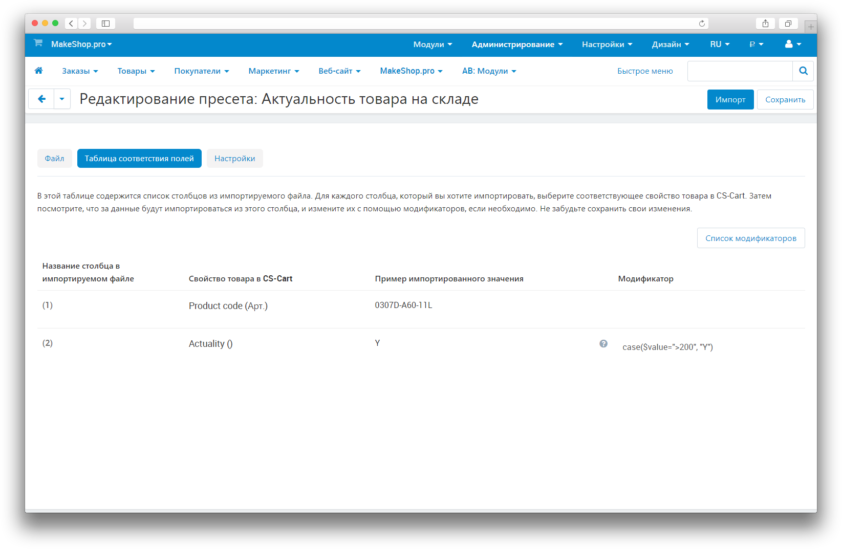 Теперь перейдите на вкладку Таблица соответствия полей и выберите соответствующие поля. Для поля с наличием товара у поставщика укажите свойство Actuality(). В столбце Модификатор укажите нужный нам, например, если хотите показывать клиенту, что товар наличии, когда его более 200 штук у поставщика, то модификатор для строки Actuality() будет case($value=">200", "Y"). После сохранения можно использовать этот шаблон вручную или же автоматически с помощью cron.