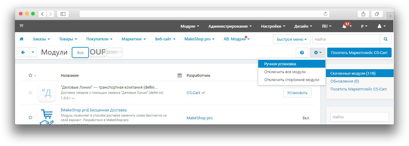 После скачивания модуля, его установка производится штатными средствами CS-Cart на странице Панель администратора → Модули → Управление модулями → Загрузить и установить модуль (+).