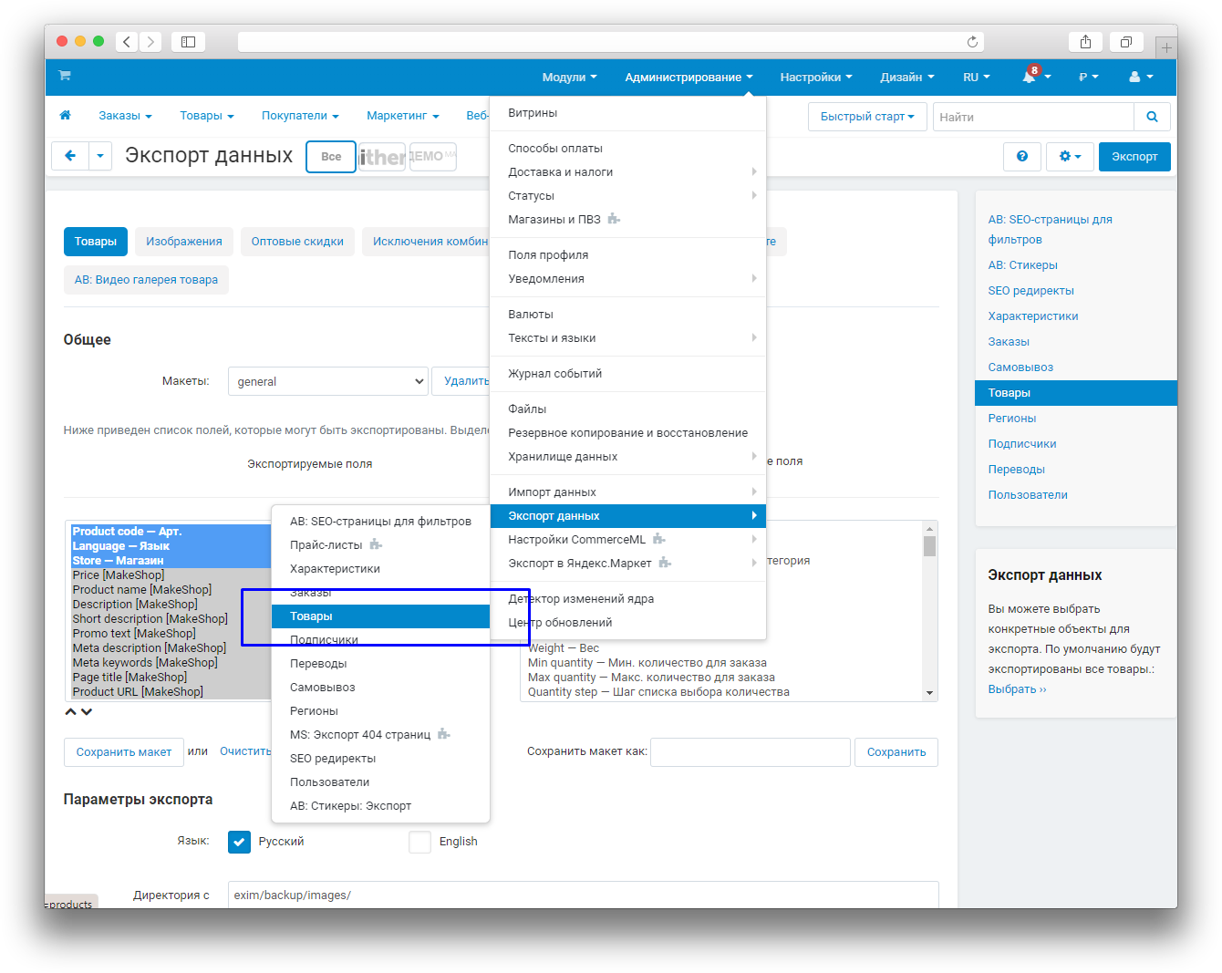 - Выбираем необходимые товары или экспортируем все через Администрирование - Экспорт - Товары;