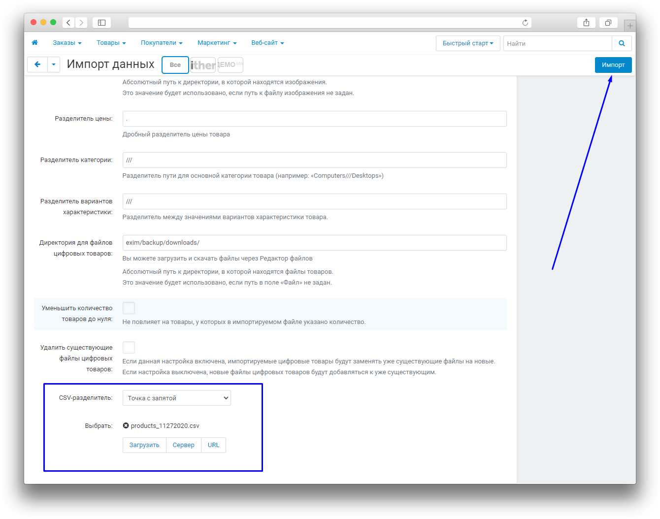 - Указываем название, выбираем файл, указанный в csv файле разделитель и жмем Импорт.